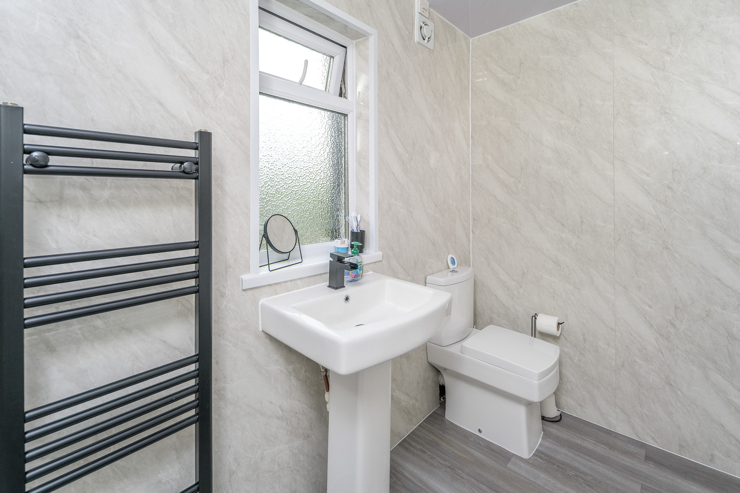 The recently renovated family bathroom overlooks the rear and comprises a contemporary white WC with a push button, a contemporary pedestal wash hand basin, a white bath with black-finished shower over behind a glass shower curtain, a black heated towel rail and an extractor fan. The room is fully wet-walled in marble-effect finish and grey LVT flooring the floor creating a crisp and fresh feel.