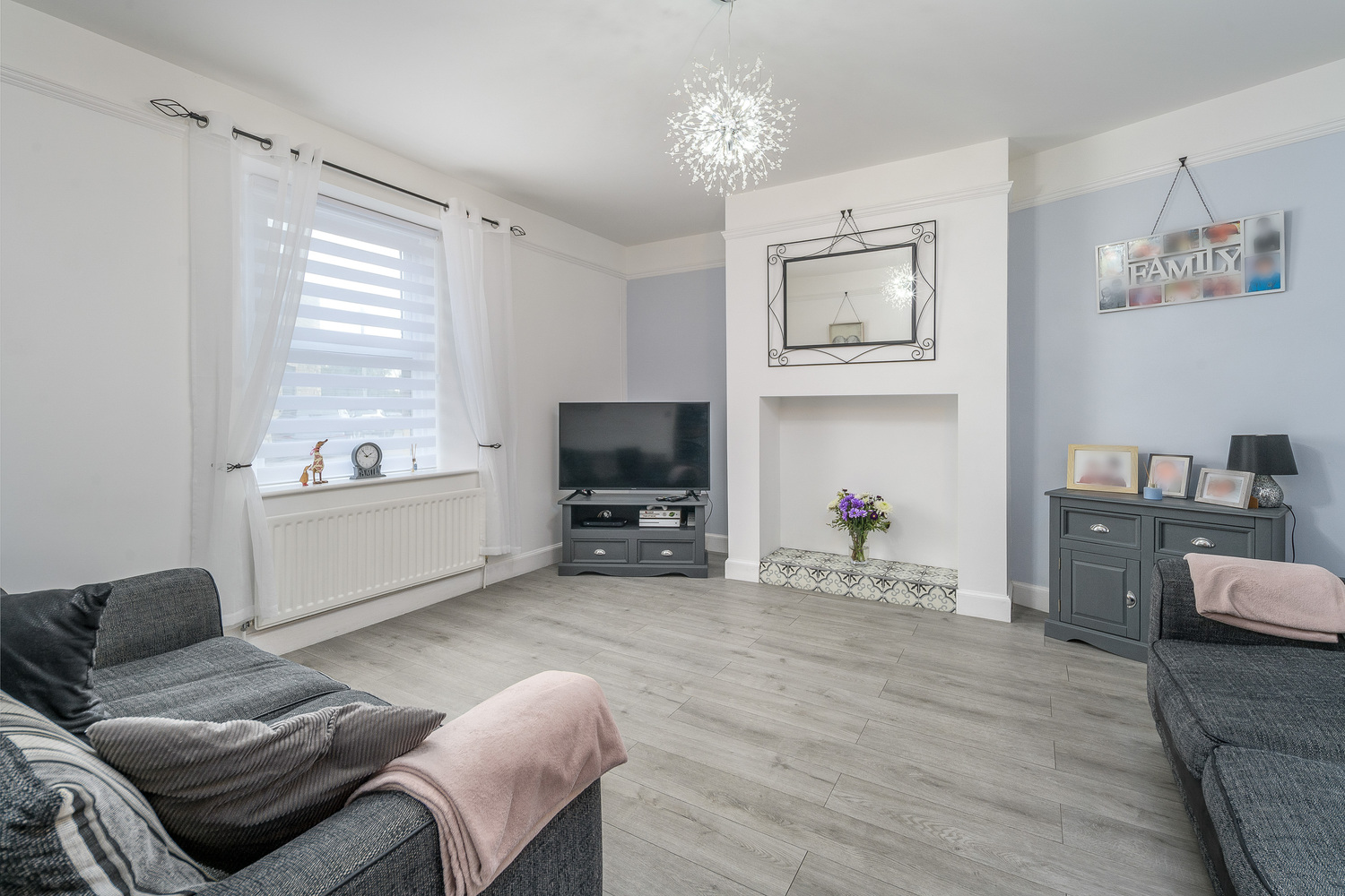 The first solid wood door leads to the spacious living room. The large window to the front allows a wealth of natural light to circulate. The original picture rail is a wonderful feature as is the fire surround which incorporates an electric fire.