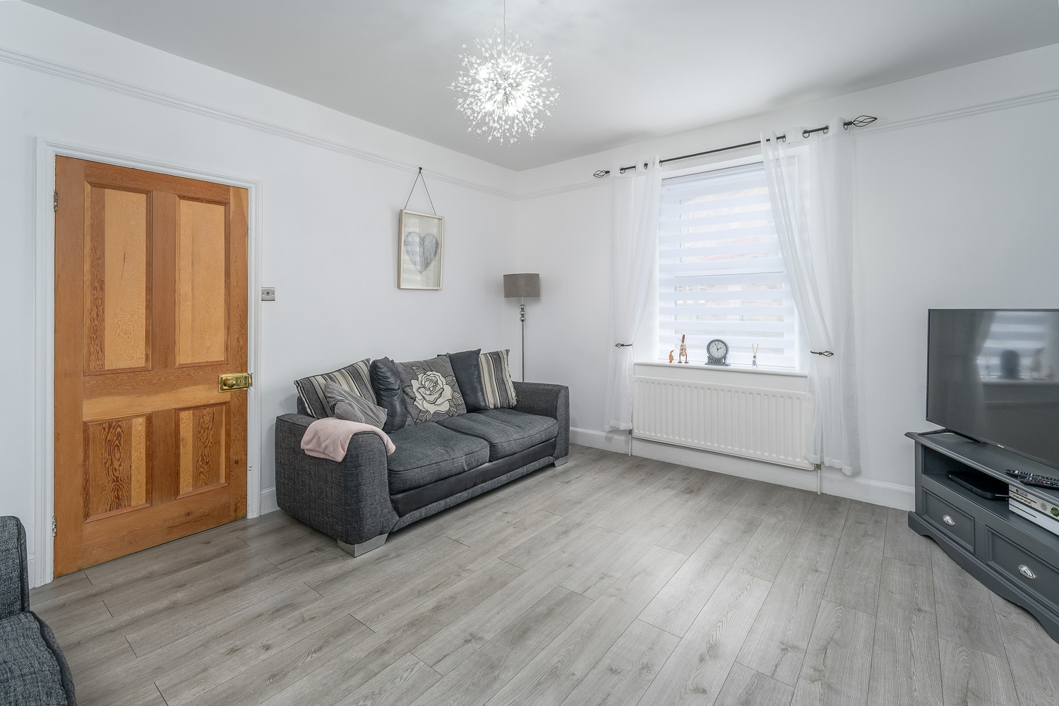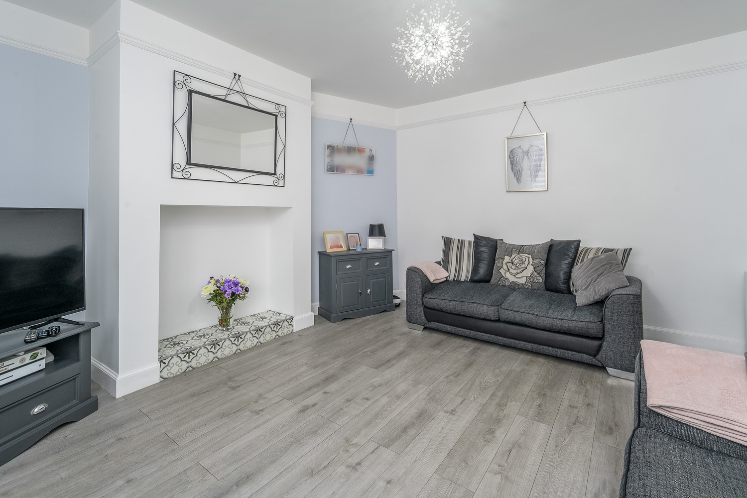 From the hallway an opening leads to the sizeable kitchen/diner, which has been recently renewed. The kitchen end features a good number of crisp white wall and base units complemented by a white and grey marble effect worktop and matching upstand. The kitchen features an electric under bench oven, a four burner gas hob with an extractor fan above and a glass splashback behind, and a single bowl stainless steel sink. In addition, there is plumbing and space for a washing machine, whilst the gas boiler is housed in a cupboard in the kitchen for ease of access. Natural light enters via a large window overlooking the rear parking area and a uPVC door provides access to the rear of the property. The dining end of the space accommodates a dining table and accompanying chairs comfortably in addition to a free standing fridge freezer.