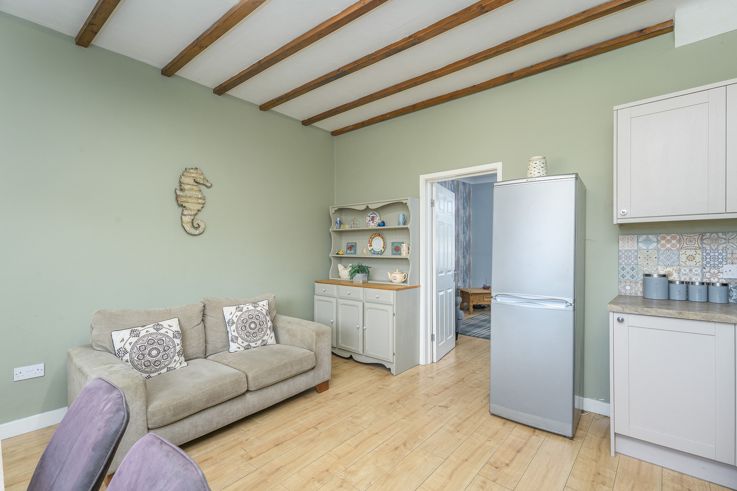 There is plenty of room to sit and dine with further opportunity to accommodate comfortable seating making the kitchen-diner a sociable space in which to spend time with family and friends. The spacious kitchen offers a good number of wall and base units with a contemporary light grey door complemented by a contrasting cement/marble effect work surface and multi-coloured arts and crafts style splash back tiling. In terms of fitted equipment, there is a four-burner gas hob, an under bench electric oven beneath a chimney style extractor fan and a single bowl stainless steel sink. There is plumbing and space for a washing machine, space for a free-standing fridge-freezer and a large dresser. The Baxi gas boiler is housed in a wall unit for ease of access. Ceiling beams add charm to this light and airy room which is illuminated beautifully by natural light entering via a large window overlooking the rear courtyard. A door leads to the rear porch where a uPVC door provides external access to the courtyard.