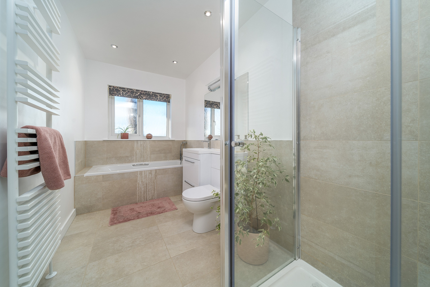 The family bathroom showcasing beautiful tiling, comprises a bath with a handheld shower over, a double sized shower cubicle with a walk behind screen and standard shower head above, a vanity unit which incorporates a hand wash basin and a concealed cistern toilet with a push button behind, a ladder rack style towel rail and sliding door storage. Further storage is available in the sizeable airing cupboard further along the hallway as you approach the utility room which offers additional wall and base units, plumbing and space for a washing machine and a single bowl stainless steel sink within the work surface with brick style splash back tiling behind. A window to the side allows for natural light and a door from the utility opens into the double garage, with an electric up and over door, which presents further storage options and space for a second fridge-freezer and a tumble dryer. Natural light enters via two windows.