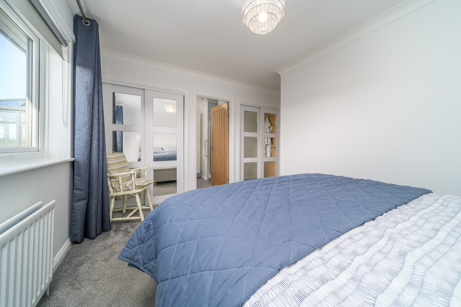 The principal bedroom is a spacious light and bright king-sized room with a large window overlooking the garden and two banks of fitted wardrobes offering excellent storage. The en-suite comprises a close coupled toilet with a push button behind, a vanity unit with a hand wash basin on top and a wall mounted mirror over, a further storage unit and a shower cubicle, with wet walling and electric shower within. The space is finished with grey tiling creating a sleek and stylish look which is illuminated perfectly by the natural light entering.
