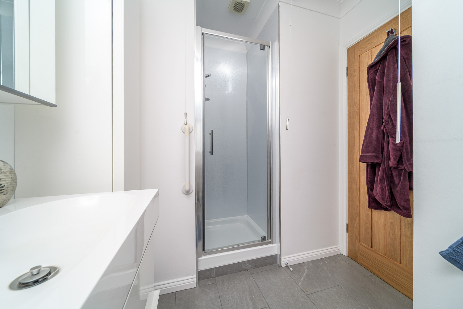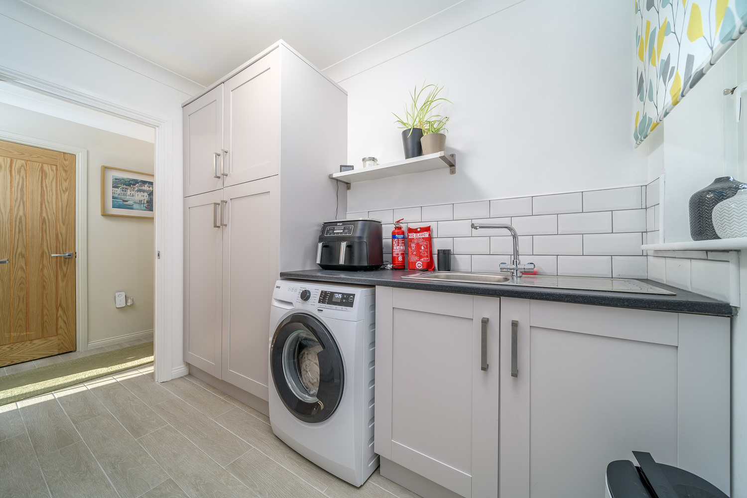 Spacious and inviting, the kitchen-diner appeals to modern living where there is plenty of space to sit and dine whilst being able to chat to those creating culinary delights within the kitchen. With a bank of storage units in addition to plenty of wall and base units the kitchen is a superb space which is illuminated by natural light entering via three windows. The unit doors are a combination of light grey and grey/blue complemented by a contrasting stone effect laminate work surface with a waterfall edge and matching up stand which creates a sublime look. In terms of fitted equipment, there is a fridge-freezer, a single bowl acrylic sink, a double oven with a microwave above, a Zanussi hob with a stainless-steel splash back behind and an extractor fan above, a dishwasher and a wine cooler. Additional lighting is by way of under unit lighting and ceiling spotlights.