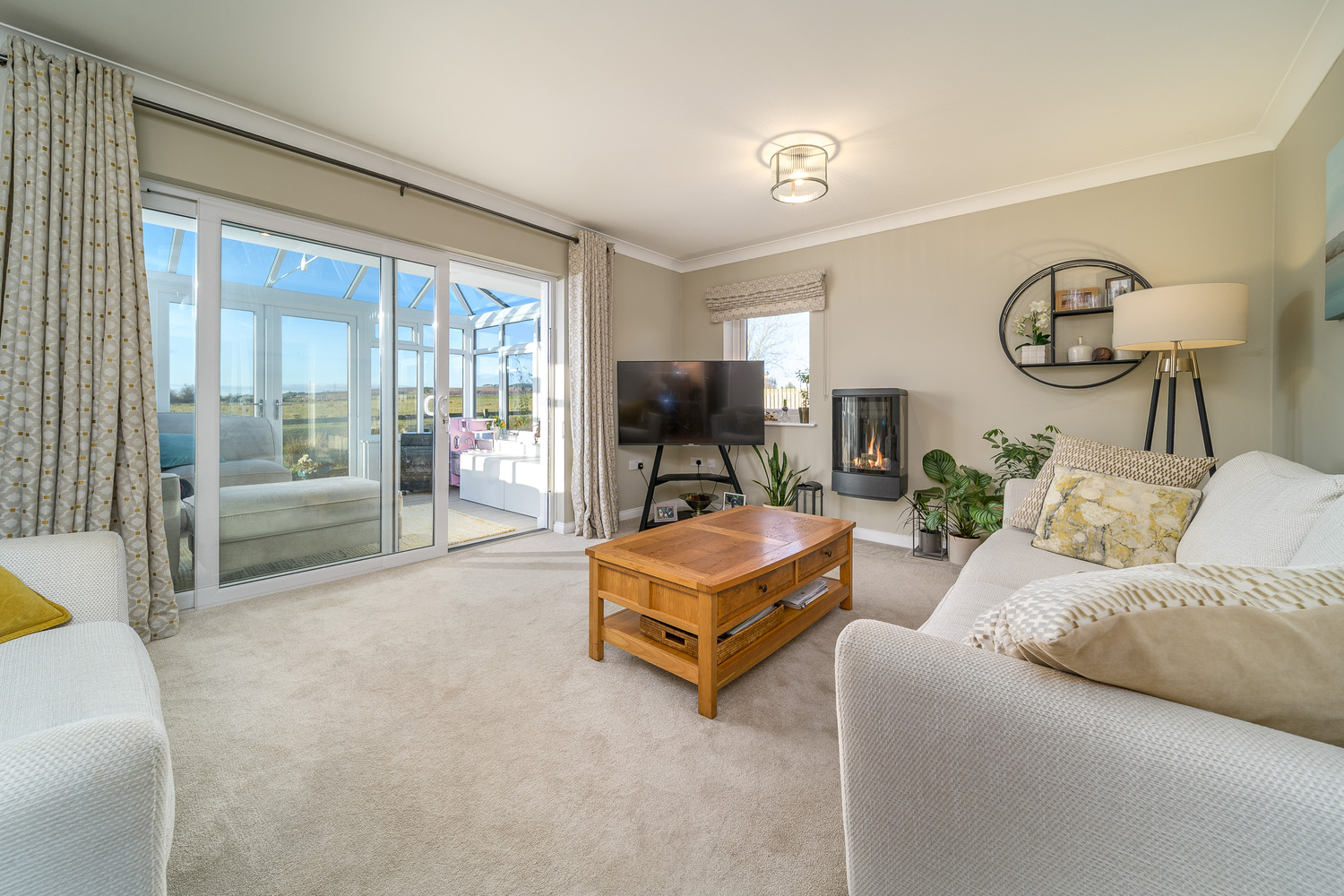 The lounge is a warm and welcoming room showcasing a sumptuous carpet creating comfort as you move throughout. A wall-mounted gas feature fireplace forms an attractive focal point enticing you to sit before it during the cooler months. A window to the side allows for natural light and sliding doors open into a gorgeous garden room, with a glass roof and many windows, which takes full advantage of the stunning views of the garden and the countryside beyond. A pair of doors provide access to the garden creating free flow of movement between indoor and outdoor living.