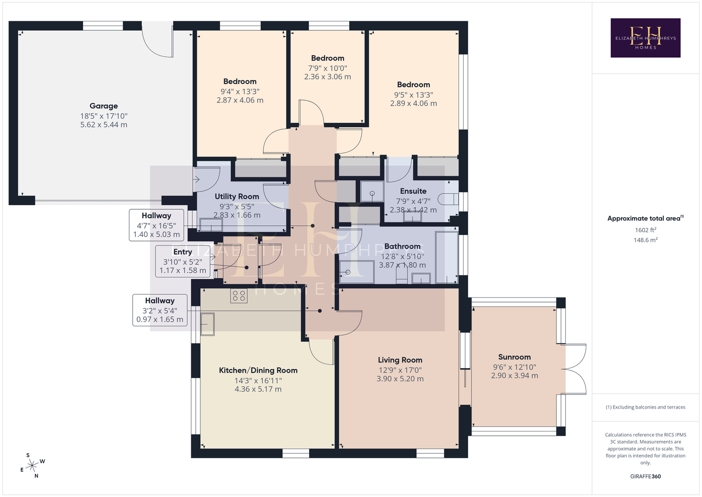 The family bathroom showcasing beautiful tiling, comprises a bath with a handheld shower over, a double sized shower cubicle with a walk behind screen and standard shower head above, a vanity unit which incorporates a hand wash basin and a concealed cistern toilet with a push button behind, a ladder rack style towel rail and sliding door storage. Further storage is available in the sizeable airing cupboard further along the hallway as you approach the utility room which offers additional wall and base units, plumbing and space for a washing machine and a single bowl stainless steel sink within the work surface with brick style splash back tiling behind. A window to the side allows for natural light and a door from the utility opens into the double garage, with an electric up and over door, which presents further storage options and space for a second fridge-freezer and a tumble dryer. Natural light enters via two windows.
