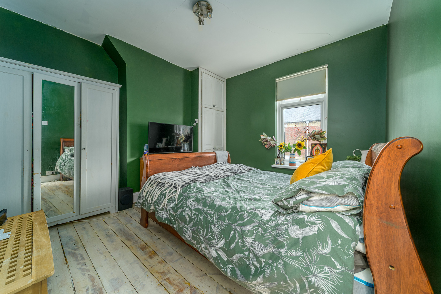 The principal bedroom is a spacious double room with a window overlooking the front of the property. There are built-in cupboards with white doors which work in harmony with the restful green coloured walls creating a crisp and fresh finish.