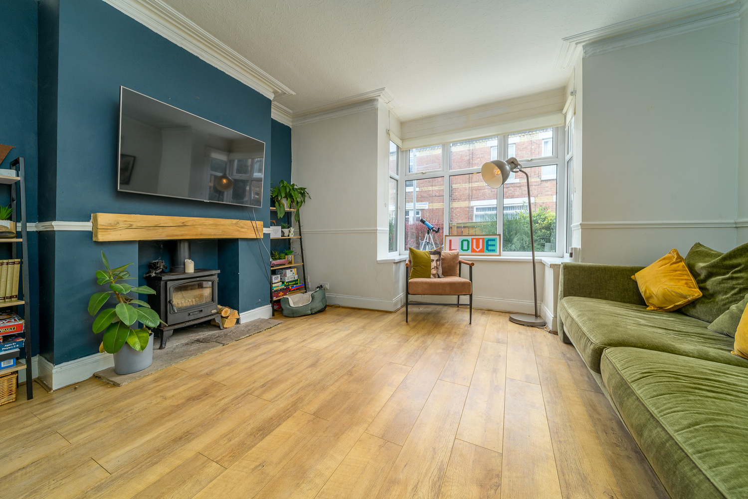 The property is approached through a pretty front garden, securely fenced to allow children and family pets to play safely, which showcases lovely cottage style well stocked borders framing the Astro-turf type lawn. The attractive blue front door opens into an internal hallway, the wood-look flooring completing the space and which extends throughout most of the ground floor creating continuity between the different spaces. Stairs ascend to the first floor and loft access is available.