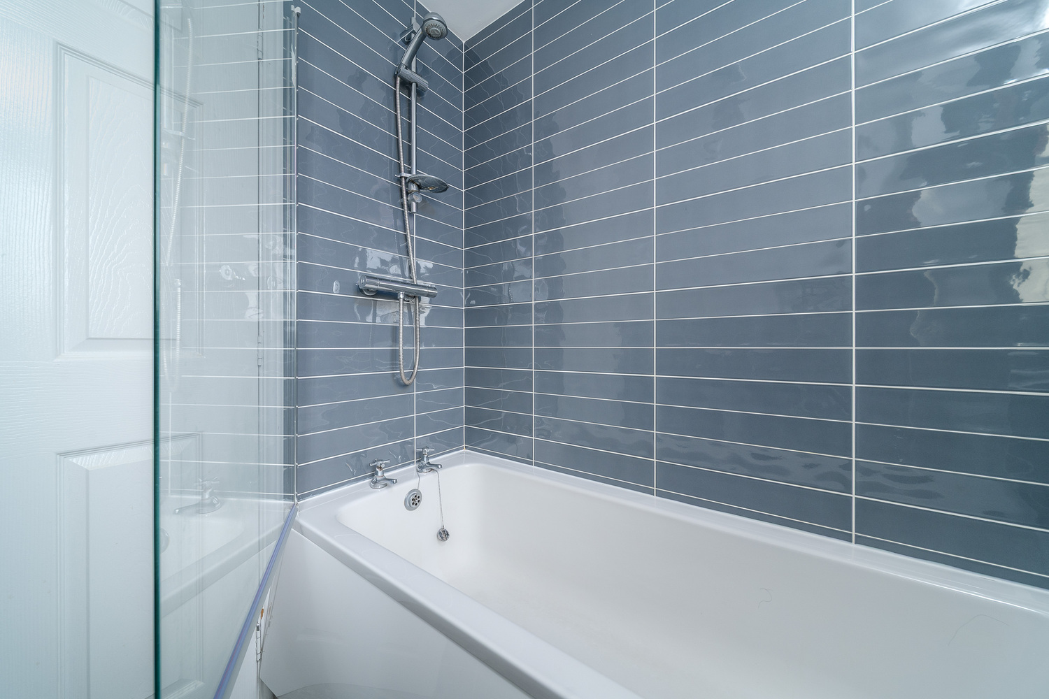 The family bathroom has also been upgraded and comprises a bath with a shower over behind a glass shower screen, a pedestal hand wash basin and a close coupled toilet with a push button behind. A chrome heated towel rail ensures added comfort, long grey brick style tiling completes the look beautifully and natural light enters via a window to the rear.