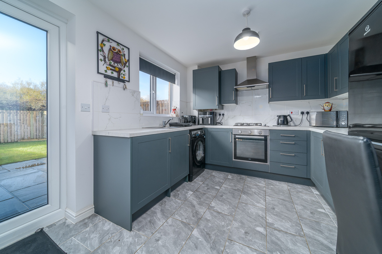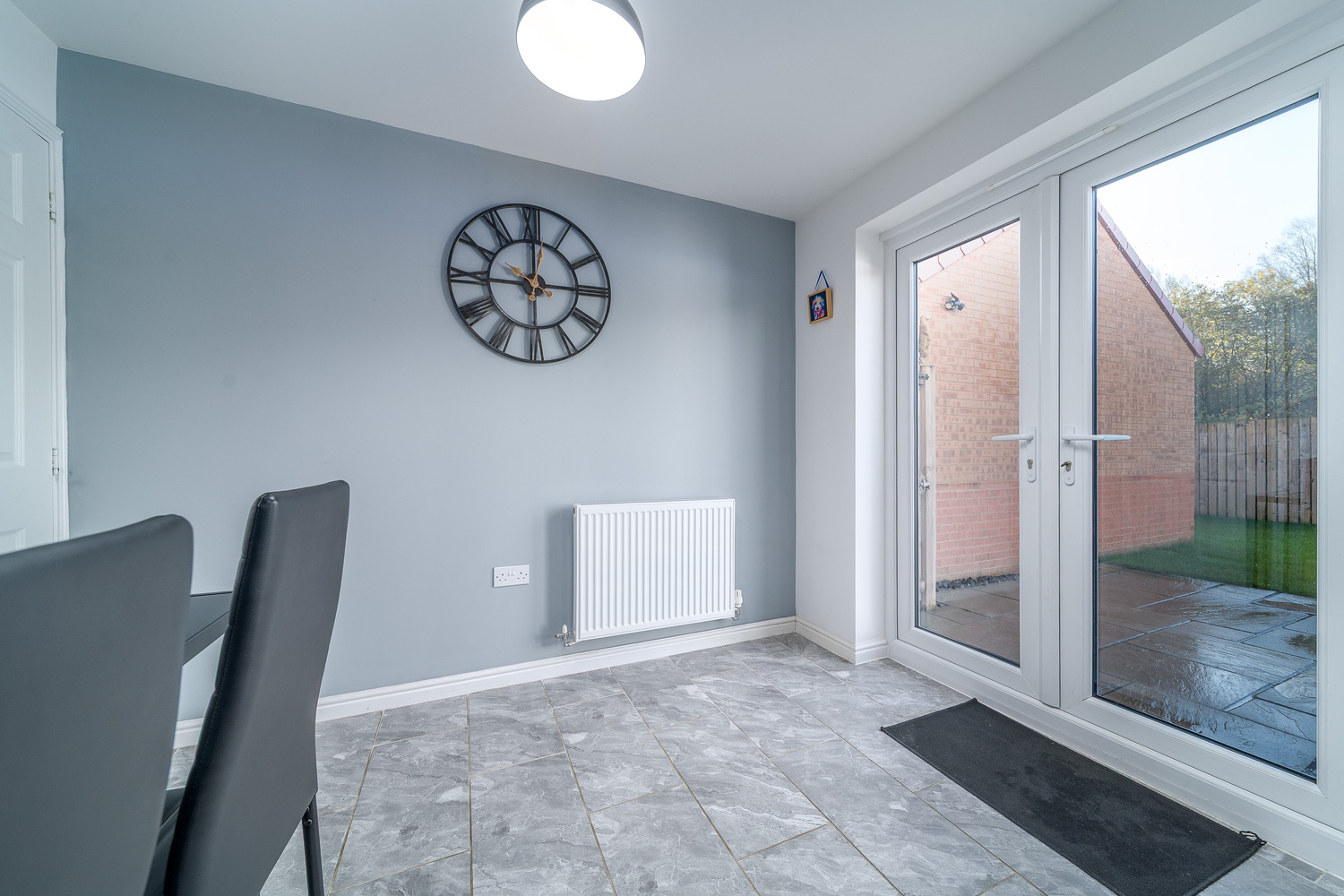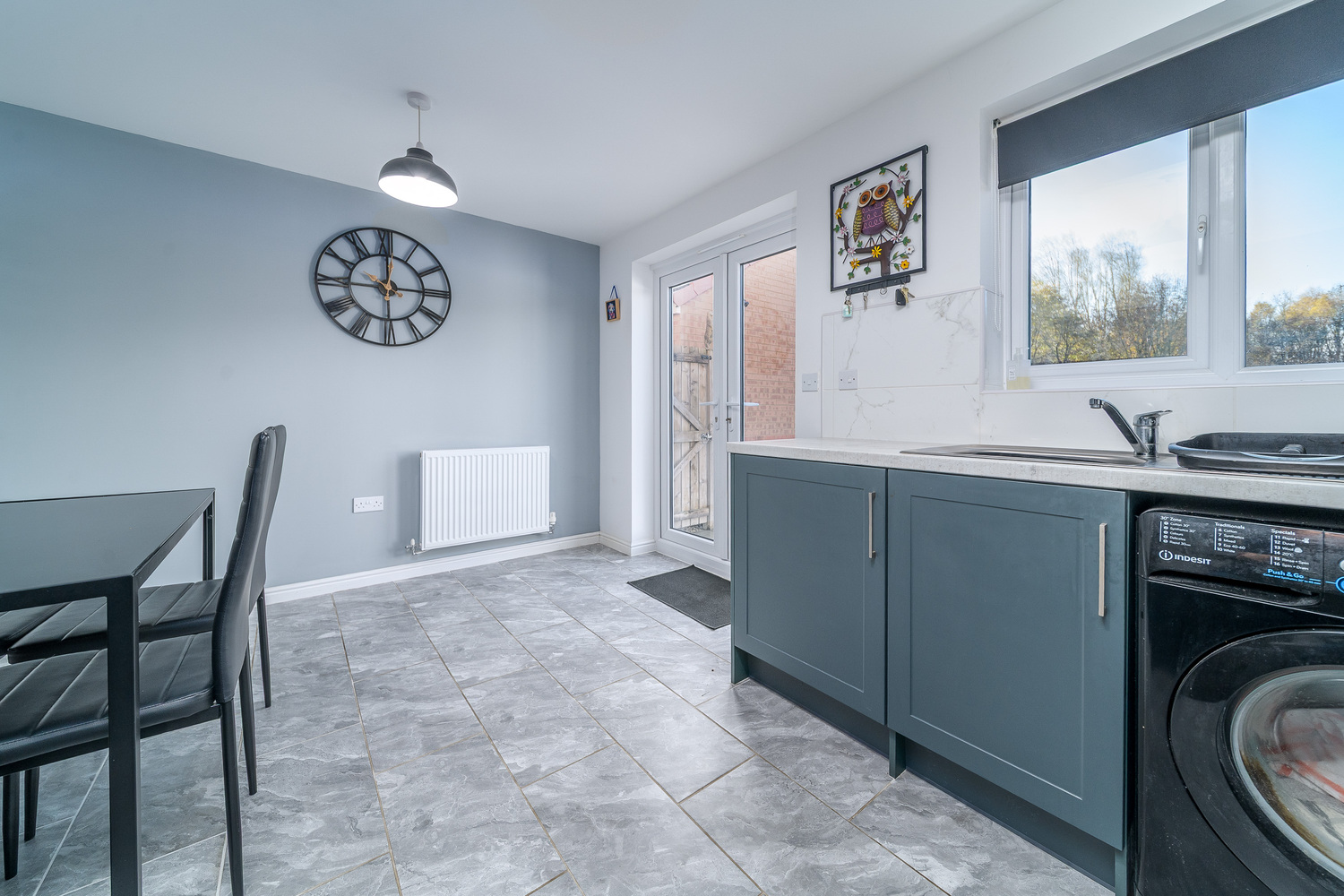 The kitchen, which has been upgraded, offers a good number of wall and base units with a green door complemented by a contrasting cement look work surface. There is a ceiling mounted extractor fan in addition to a chimney style extractor fan above a four-burner gas hob, an under bench electric oven, space and plumbing for a washing machine and space for a dishwasher if you so wished. The gas boiler is housed in a cupboard in the corner for ease of access and there is space for a free-standing fridge freezer. There is ample room for a dining table and accompanying chairs making this a wonderfully sociable area appealing to modern living. The flooring has also been upgraded and showcases lovely grey tiling which is illuminated by natural light entering via a window above the single bowl stainless steel sink. A pair of French doors open into the superbly private rear garden which facilitates free flow of movement between indoor and outdoor living.