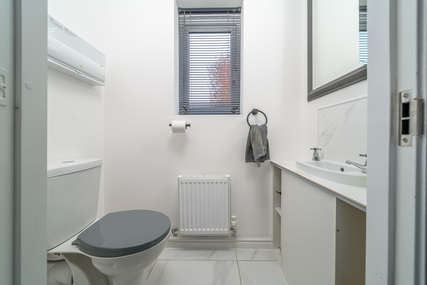 Entry is via the front door which opens into a light and bright entrance hallway. The large window illuminates the space perfectly leading to a conveniently placed and spacious ground floor WC. The suite comprises a white close coupled toilet with a push button behind and a vanity unit with a hand wash basin on top. A window allows for natural light, and the space is finished with marble effect white floor tiling creating a sleek and stylish look.