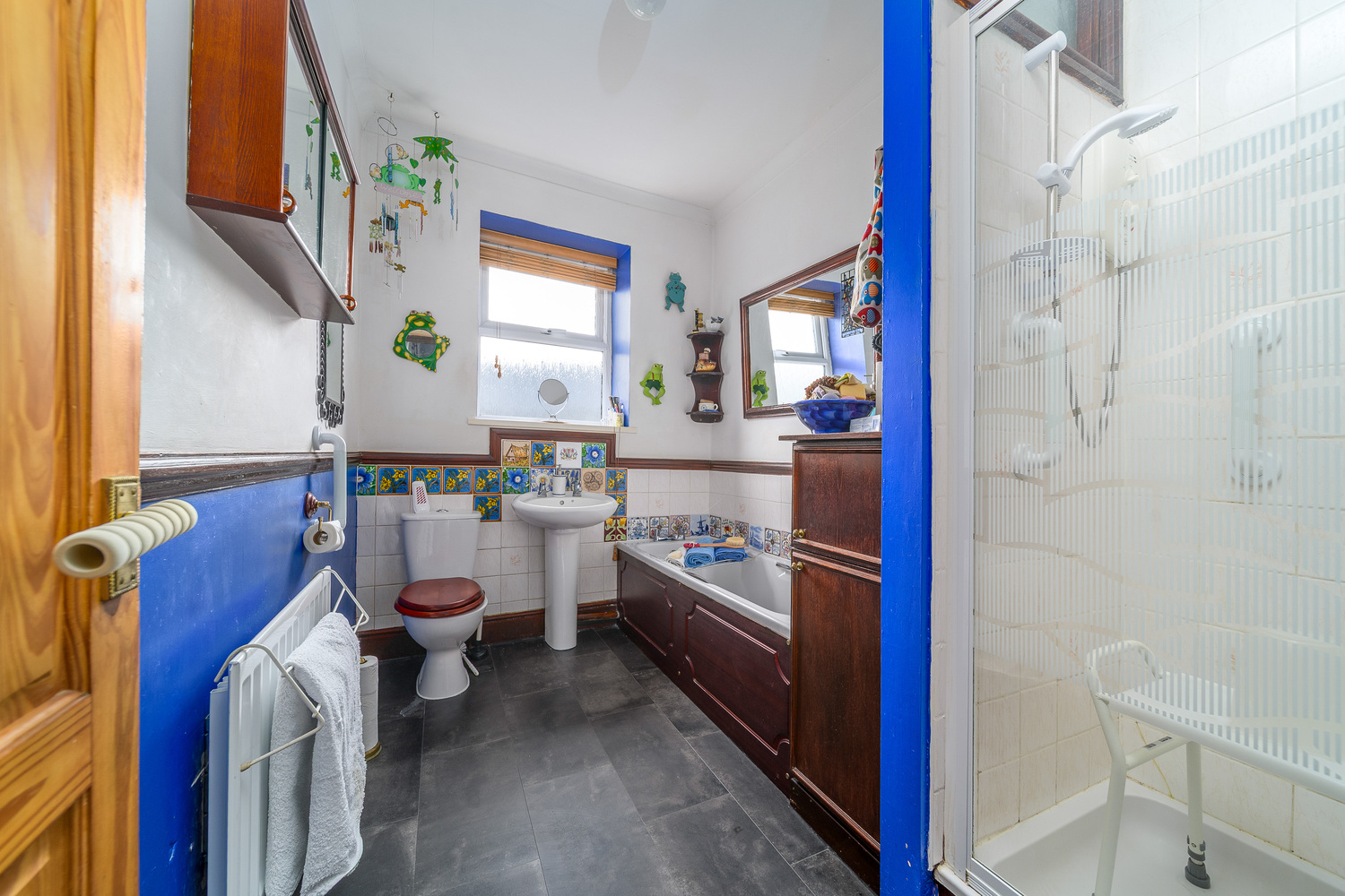 The space flows freely into the kitchen-diner which offers a good number of wall and base units with a wooden door complemented by a contrasting laminate work surface which extends to a breakfast bar offering further useful seating. There is an electric hob, an under-bench oven beneath an extractor fan and a single bowl plastic sink. There is space for a free-standing fridge freezer, a dining table and accompanying chairs and space and plumbing for a washing machine. Beneath the stairs there is a beneficial pantry cupboard. A large window overlooks the rear yard which is a private space in which you can relax at the end of the day. There is a shed which offers additional storage.