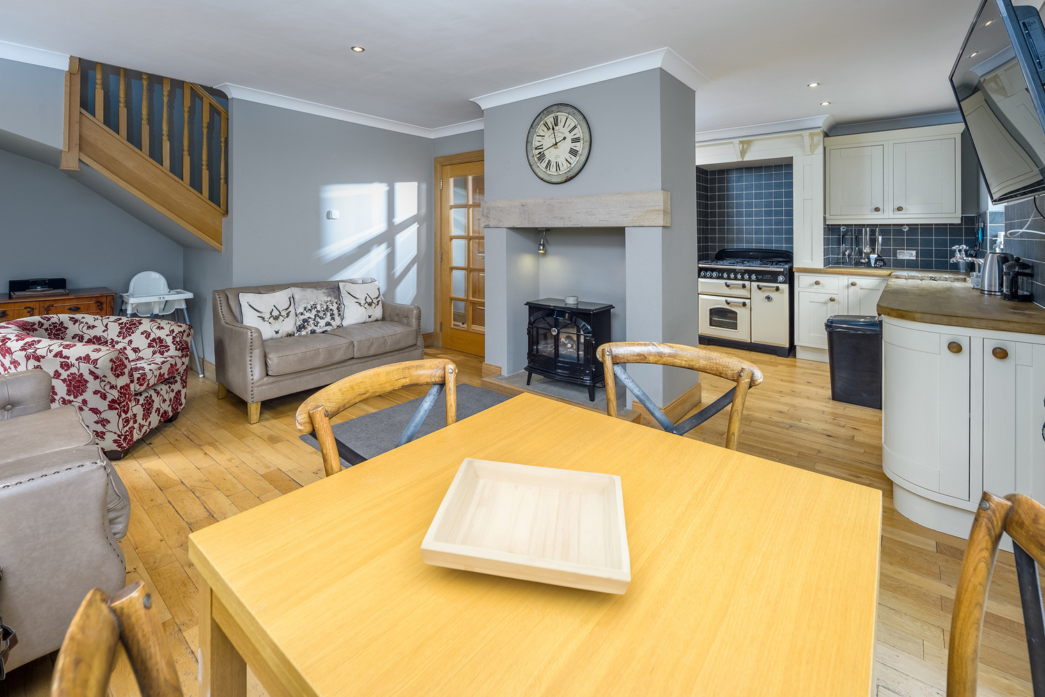 From the kitchen, round a corner, you enter the living space which is tremendously light and bright courtesy of a pair of French doors which open into the garden in addition to two further windows which capture a pleasing aspect. Furthermore, a snippet of the stairs to the first floor adds to the agreeable view and the inglenook fireplace, with a central chimney, housing an electric wood burner forms an exquisite focal point. There is plenty of space for a dining table and chairs in addition to a couple of sofas making this the perfect sociable open plan space in which you can relax and unwind from the hustle and bustle of the day.
