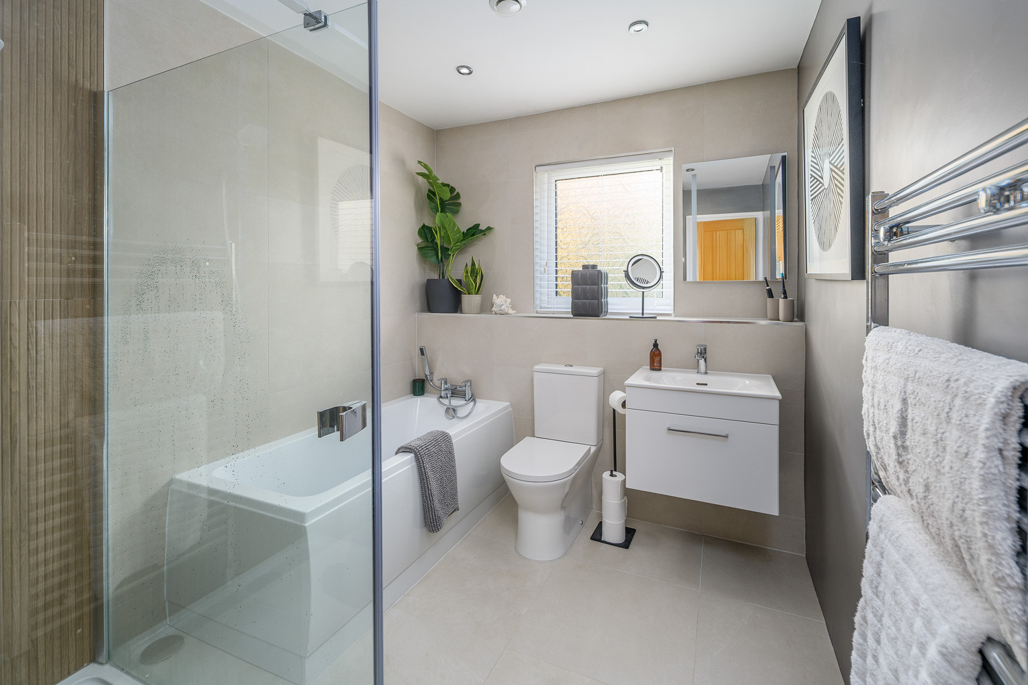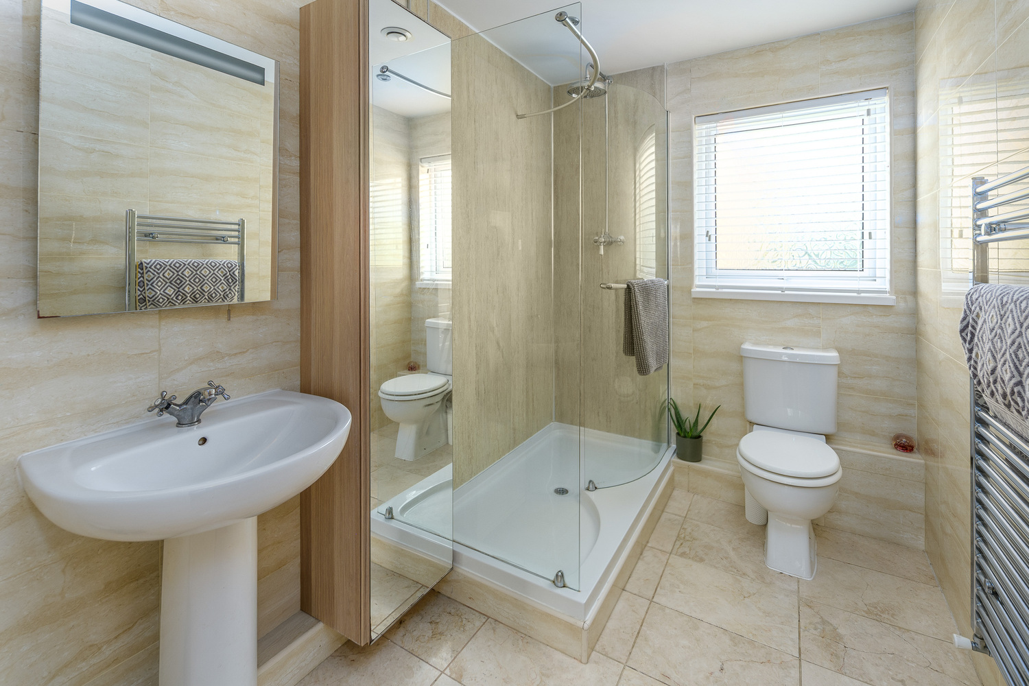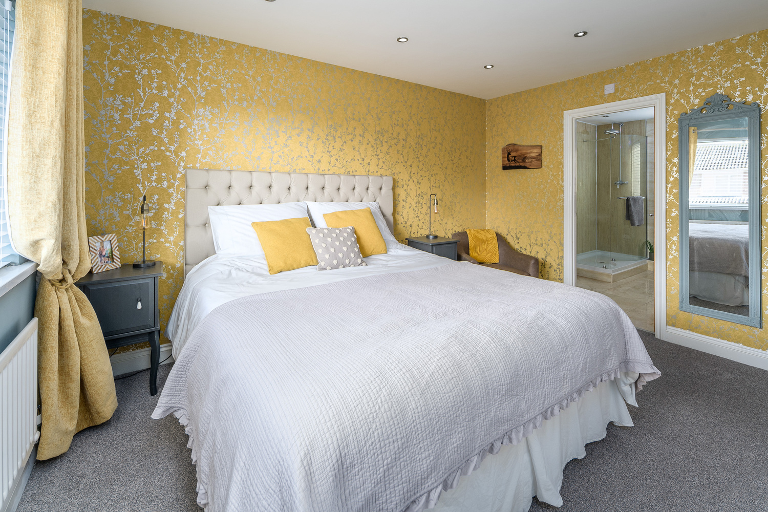 The primary bedroom is a large super king-sized room, with en-suite facilities, showcasing stunning feature walls the style of which reflects that of the lounge which creates continuity between the different spaces. This light and restful room offers plenty of space to accommodate a range of fitted furniture. The en-suite comprises a walk-in shower cubicle with wet walling and a single showerhead within, a close coupled toilet with a push button behind and a full pedestal hand wash basin with an illuminated mirror and storage above. A window, with privacy glass, allows for natural light and the space is finished with sandstone coloured tiling.