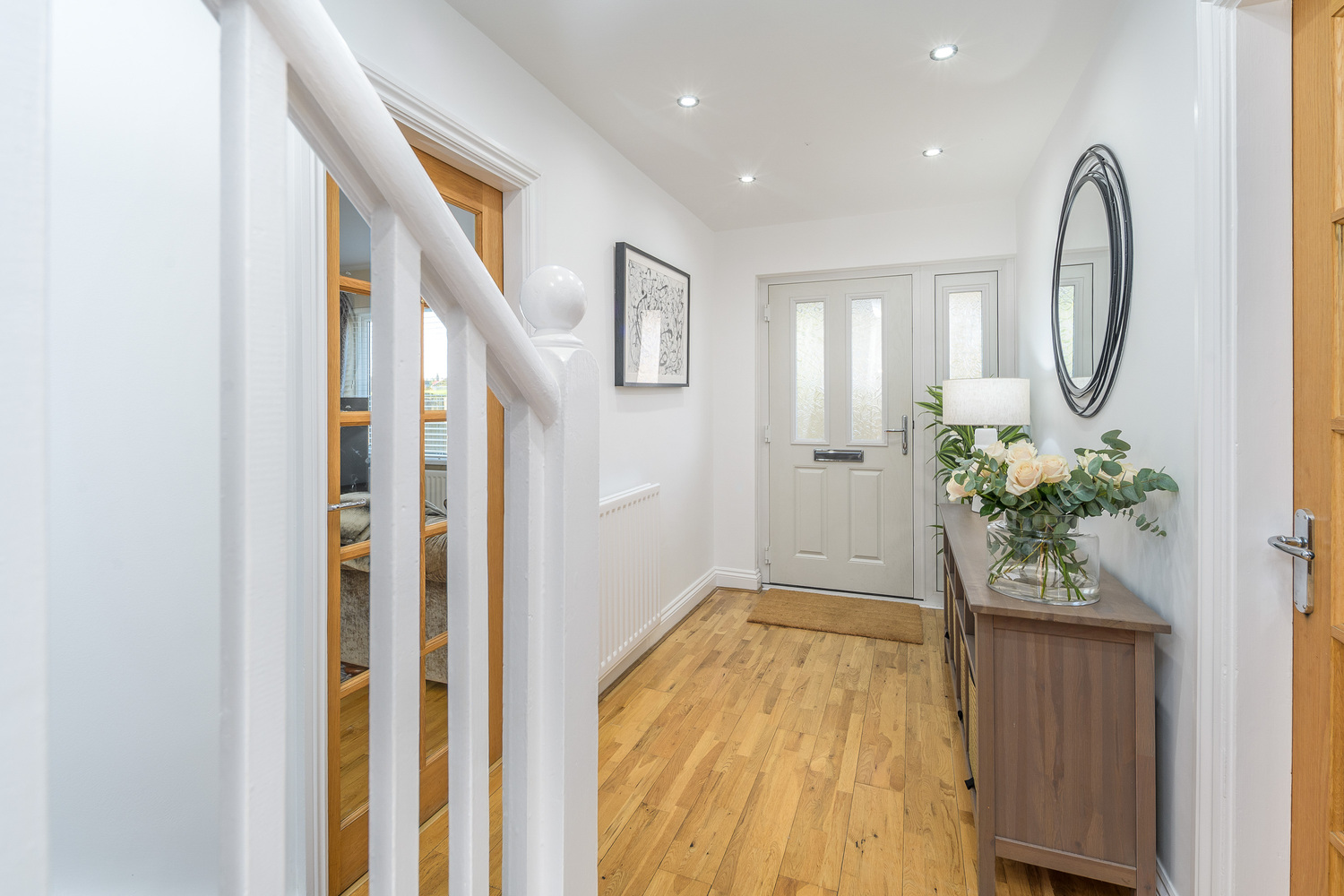 The front door opens into a spacious entrance hallway, finished with quality engineered oak flooring which extends throughout most of the ground floor. The stairs, with storage beneath, ascend to the first floor and various doors lead off. The ground floor WC is a superb asset as it negates the need to continually frequent the upstairs facilities. The suite comprises a close coupled toilet with a push button behind and a full pedestal hand wash basin before a window, with privacy glass, allowing for natural light. The space is finished with square stone effect floor tiles and half height wall tiling creating a sleek and stylish look. This room is spacious enough to be remodelled to form a shower/bathroom therefore facilitating ground floor living if you so wished.