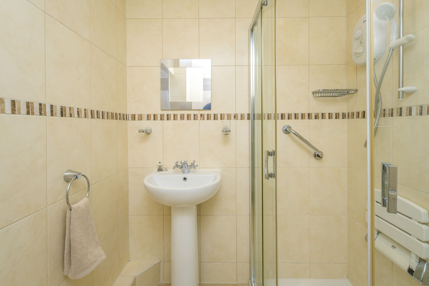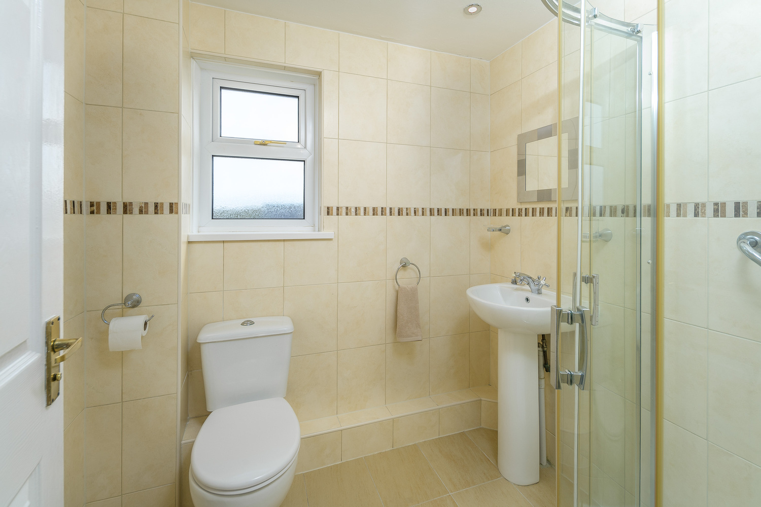 The fully tiled shower room has been finished to a high standard. The suite comprises a close coupled toilet with a push button behind, a pedestal wash hand basin and a corner shower cubicle with an electric shower within. Natural light enters via a window to the rear with ceiling spotlights adding to the brightness.