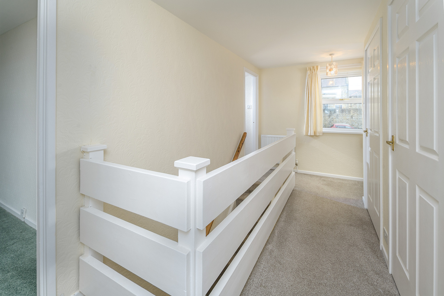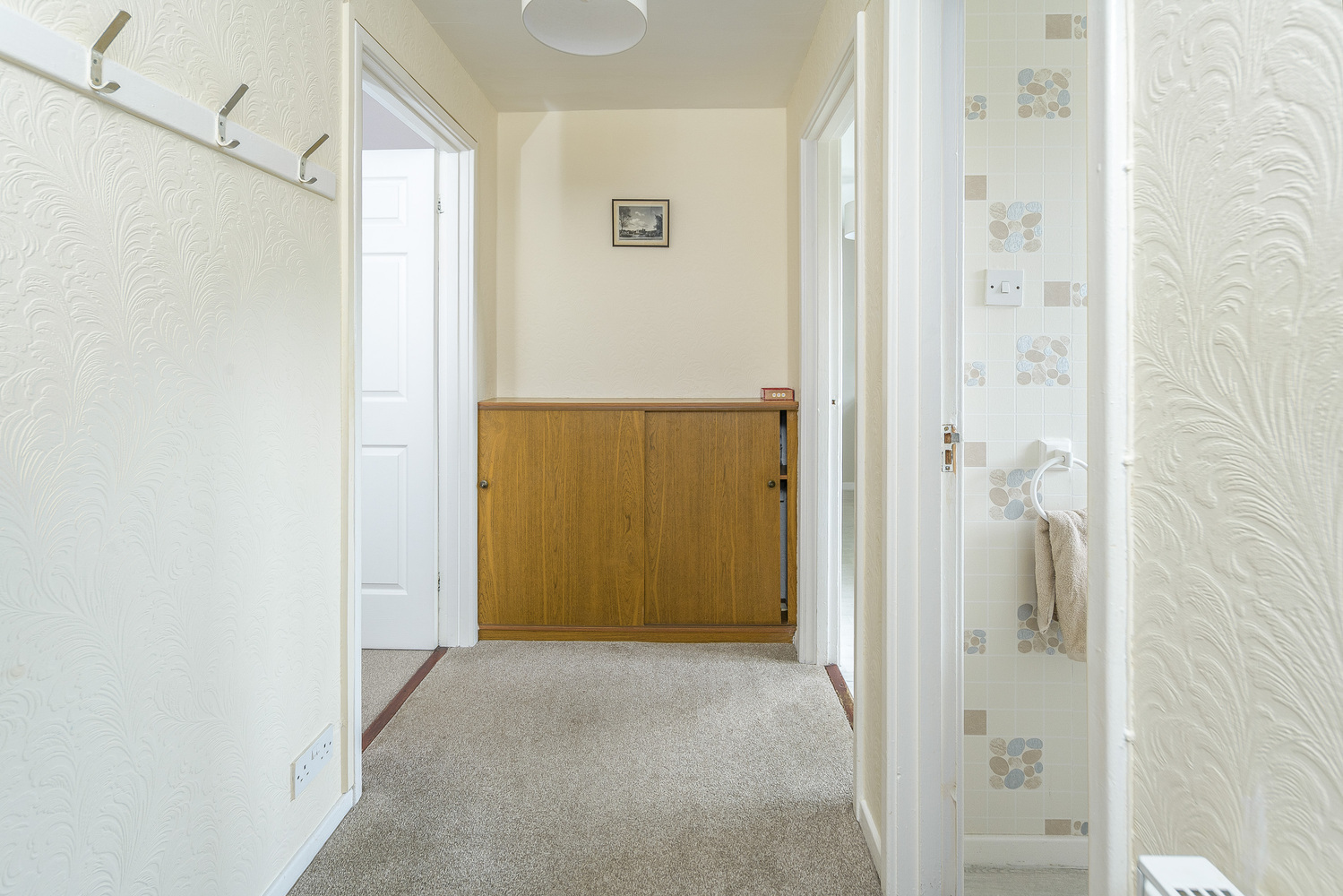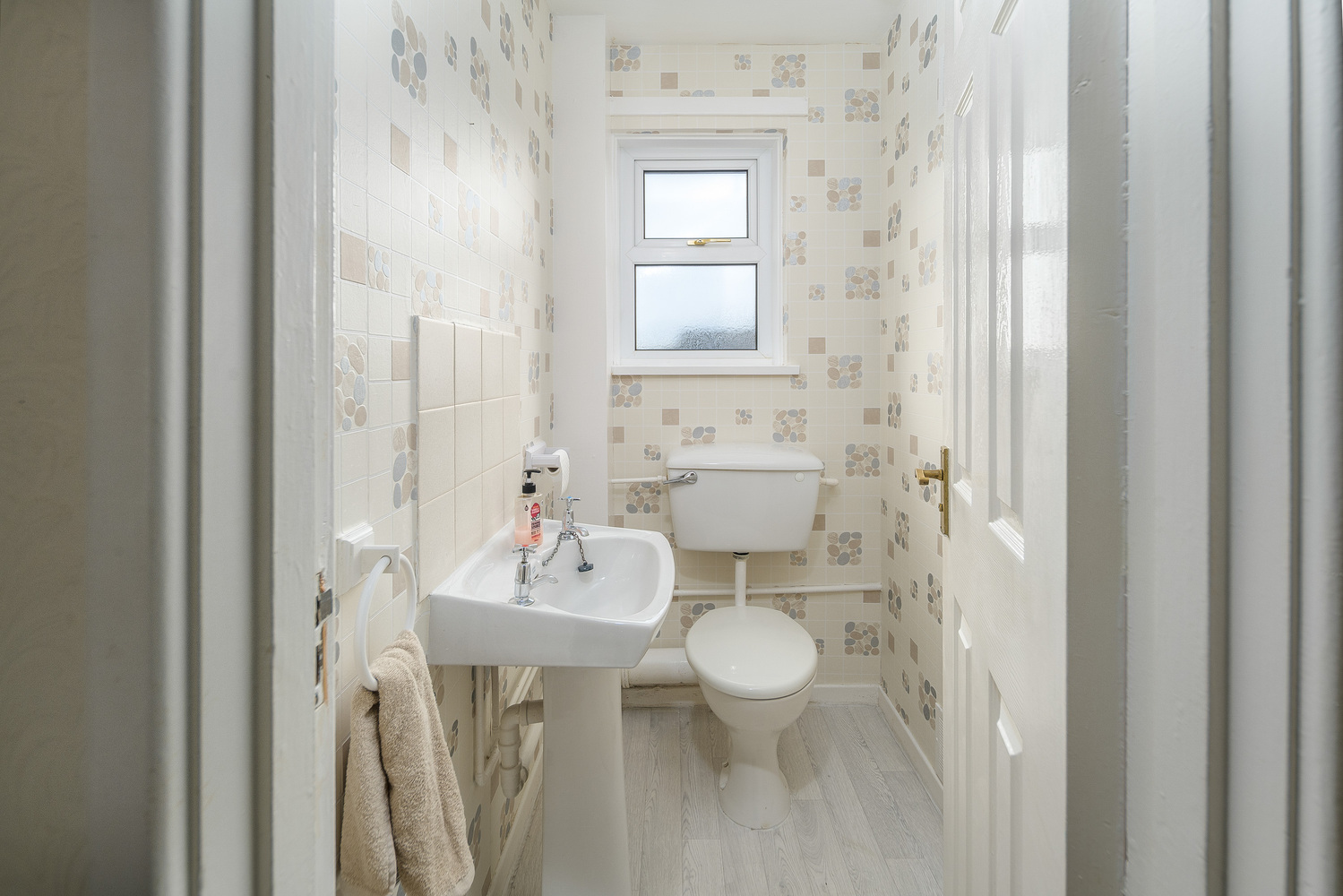 The front door opens into a sizeable entrance hallway with various doors leading off and stairs ascending to the first floor. There is a useful cupboard offering space to house coats and store shoes and suchlike. The ground floor toilet is a superb asset as it negates the need to continually frequent the upstairs facilities. The suite comprises a white toilet and a pedestal wash hand basin. A window allows for natural light. This room also has a large cupboard with shelving and the gas boiler is housed within.