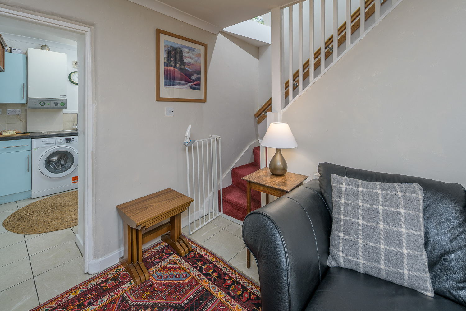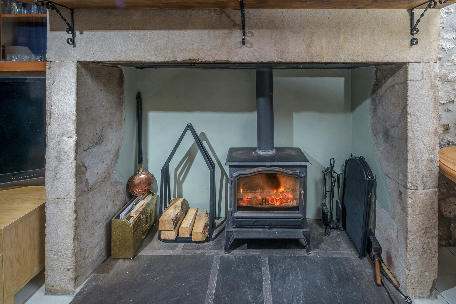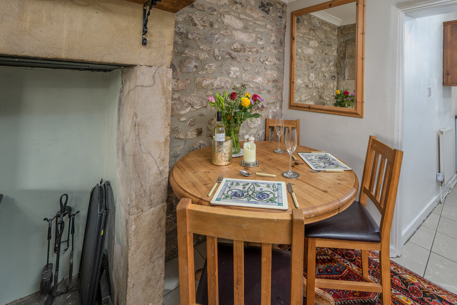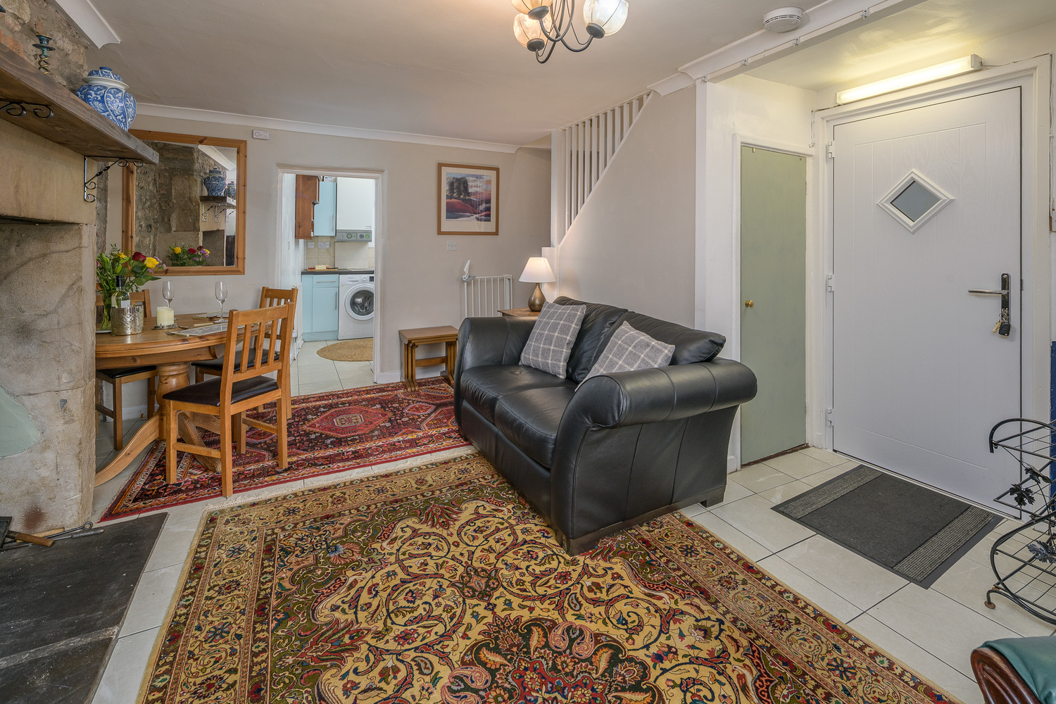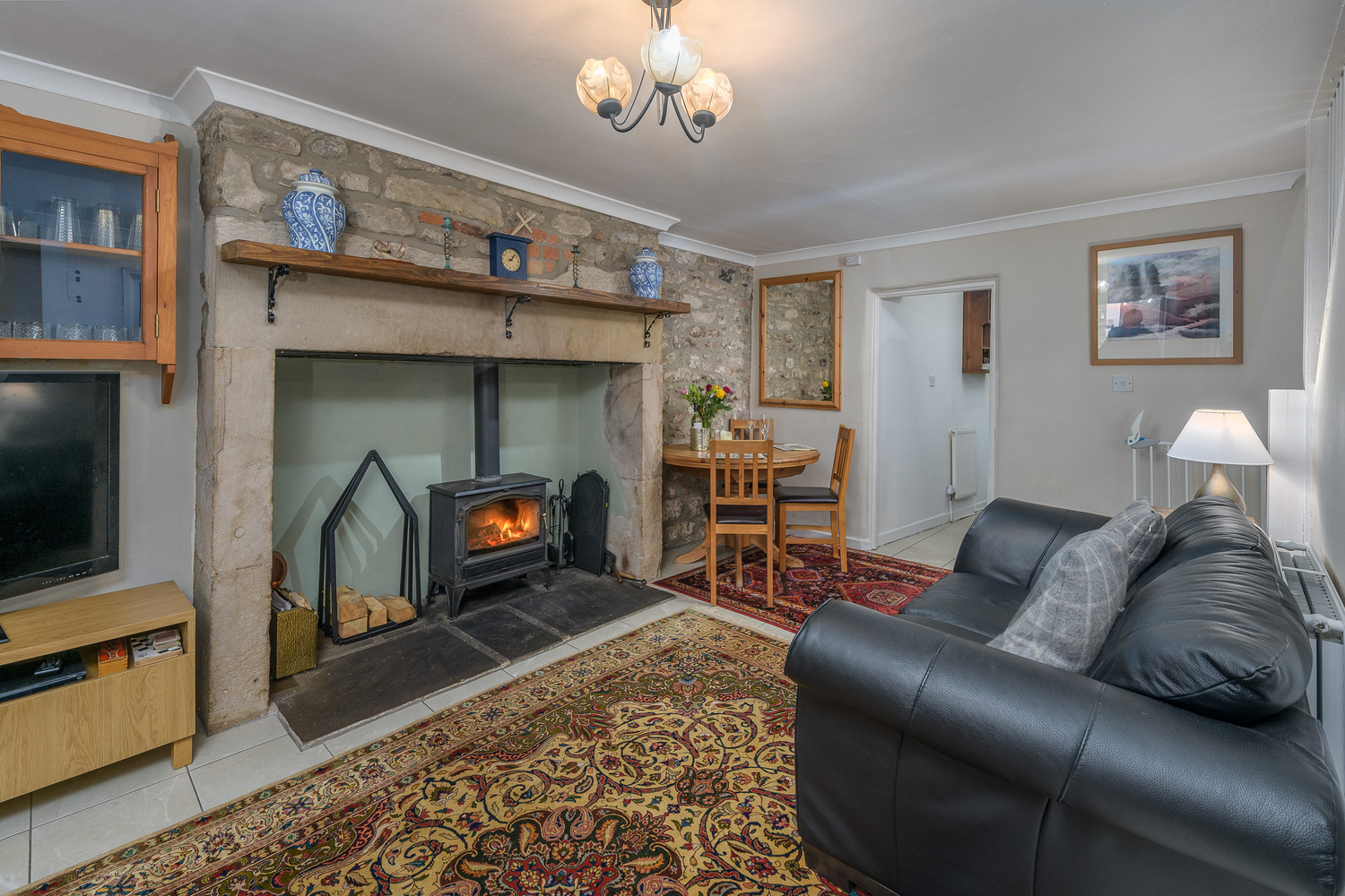 An attractive arched porch frames the way to the front door which opens into the spacious lounge-diner which impresses with its substantial stone fireplace incorporating a multi-fuel burner forming an exquisite focal point in addition to the exposed stonework behind. A window overlooks the front of the property capturing views of the church and the fields and hills beyond and there is plenty of space to sit and dine whilst appreciating this glorious view. Stairs ascend to the first floor and there is a beneficial storage cupboard. The space is finished with cream-coloured tiling which extends into the kitchen creating a seamless transition between the two areas.