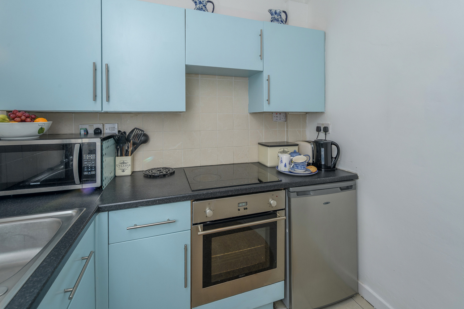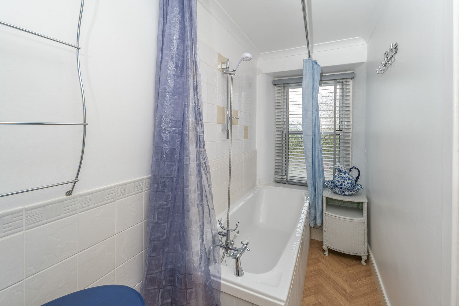 The country cottage style kitchen overlooks the rear of the property and offers a good number of wall and base units with a blue-coloured door complemented by a contrasting black work surface and cream-coloured splash back tiling. There is space for an electric cooker and hob, a free-standing fridge freezer and space for a washer-dryer.