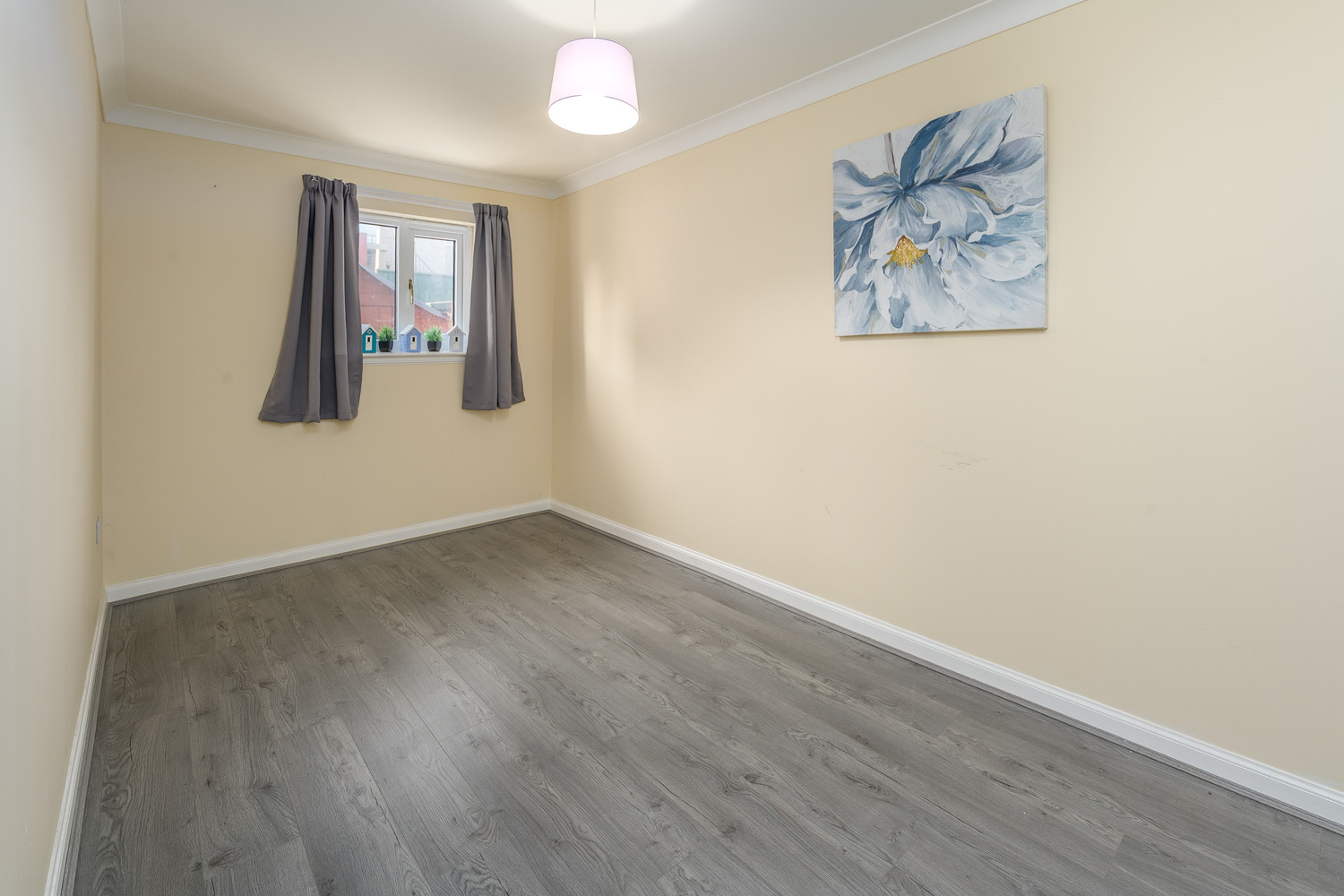 Bedroom 2 is a double room with a window overlooking the rear. Both rooms are finished with grey wood effect laminate flooring creating a sleek and stylish look.