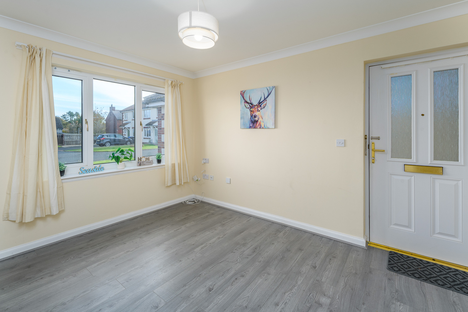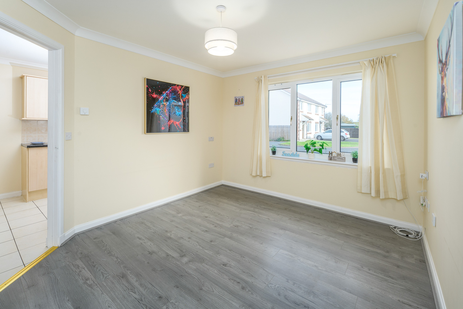 The front door opens into a light and bright lounge with a large window overlooking the front of the property. The grey wood effect flooring completes the look of this spacious and tastefully decorated room.