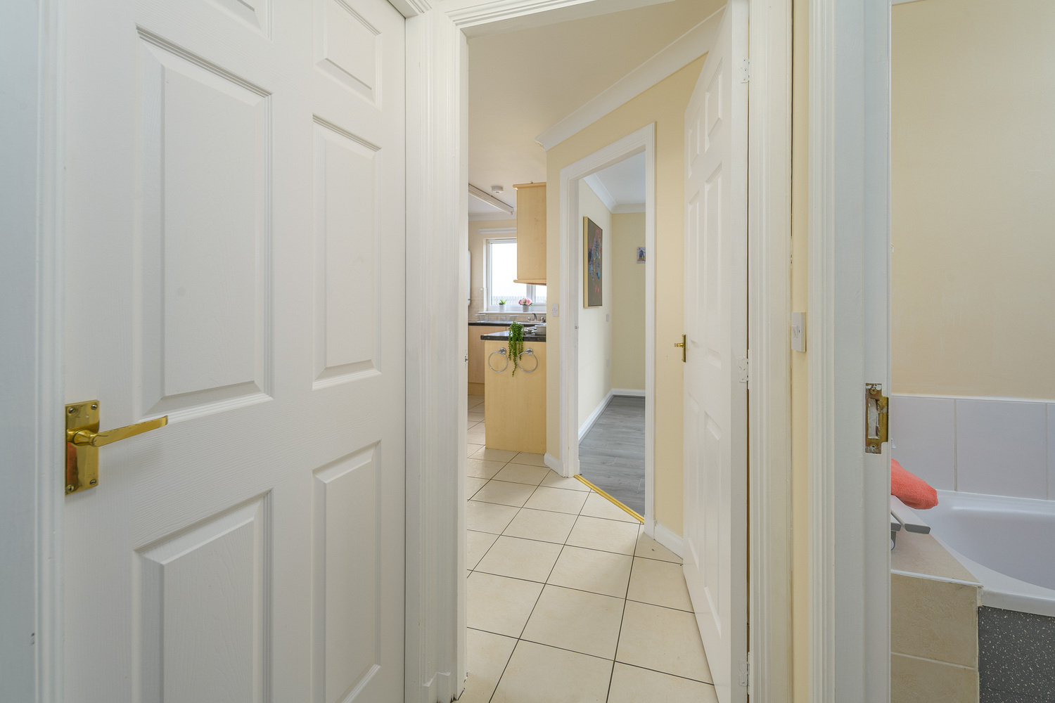 The rear hallway provides convenient access to two bedrooms and the family bathroom.