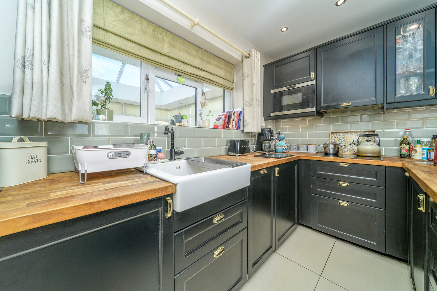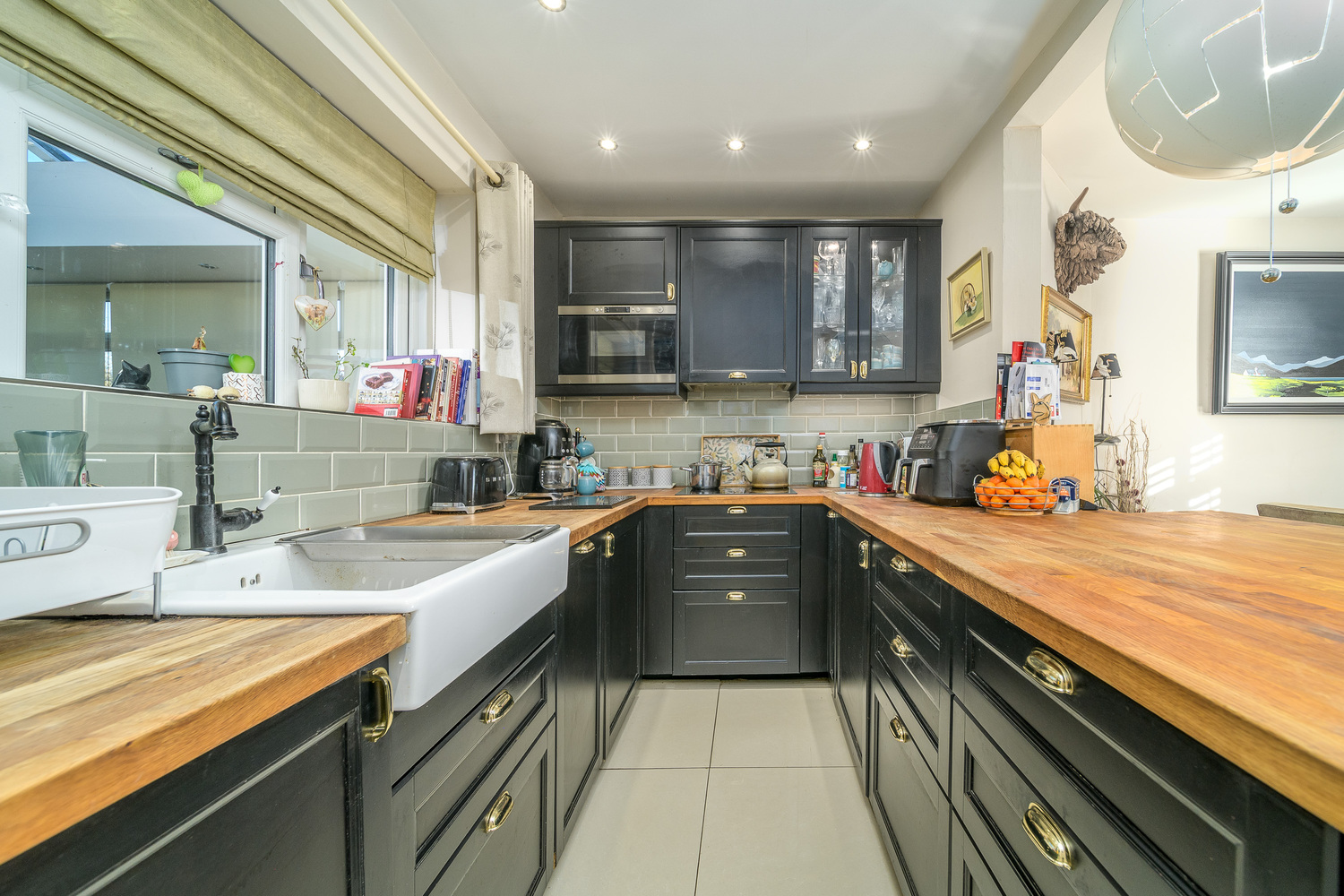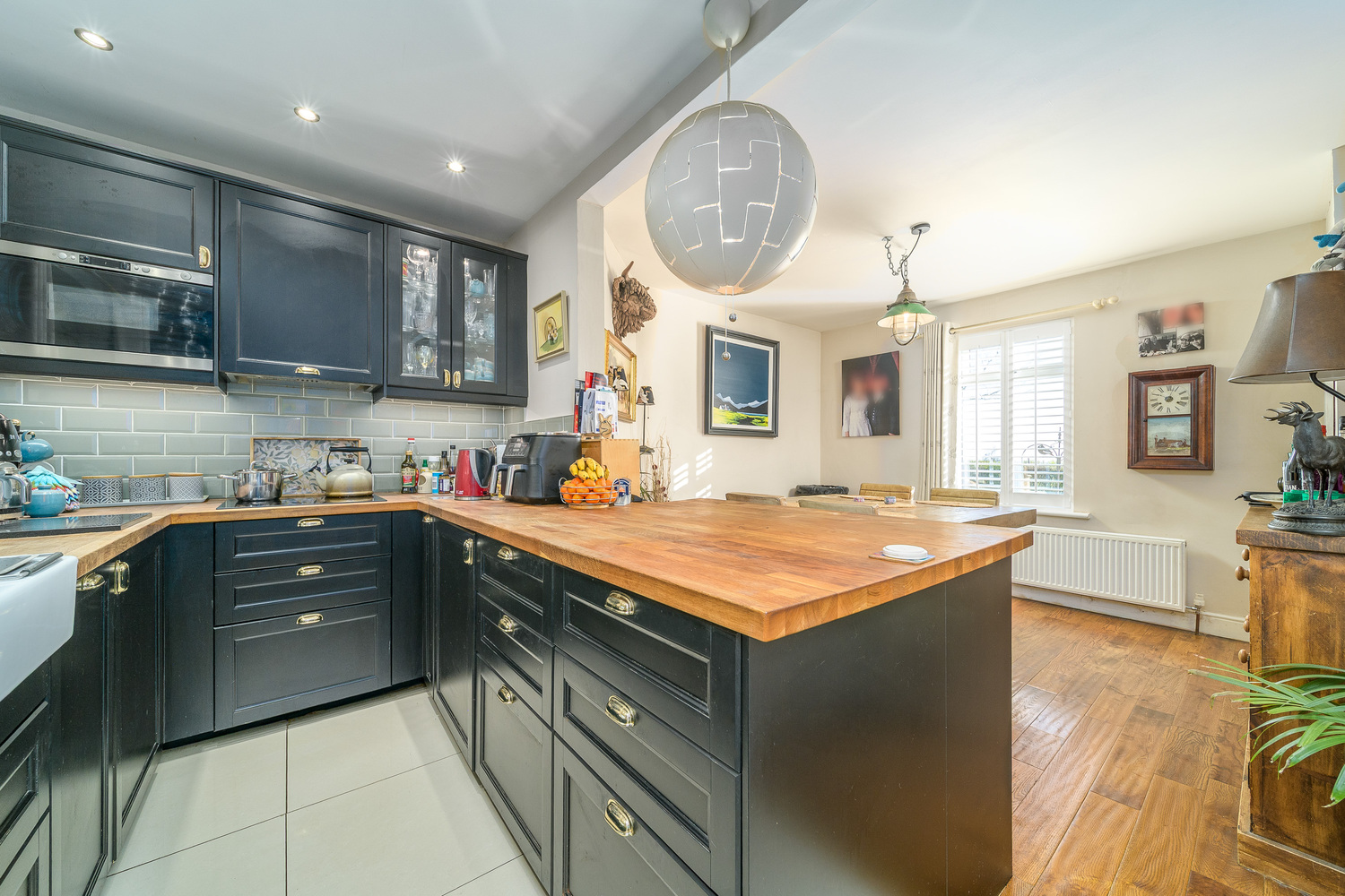 The kitchen-diner appeals to modern living and is a lovely light and bright space. The dining end of the room enjoys views over the front garden and there is plenty of space to accommodate a large dining table and accompanying chairs. One wall incorporates a feature fireplace which could be reinstated as a functioning fireplace should you so wish. Subtly dividing the dining room from the kitchen is a peninsular which offers further seating and storage including an integrated fridge. The flooring at this point blends from the oak into practical and attractive tiling within the kitchen which offers plenty of wall and base units with a black door complemented by a solid wooden work surface and a sage-green coloured tiled splash back. In terms of fitted equipment, there is an eye level double oven with pan drawers beneath, a washing machine, a single bowl Belfast sink with a black mixer tap above, a slimline dishwasher, an induction hob beneath an extractor fan, a microwave and a glass display cabinet. This is a lovely sociable space in which to chat to family and friends whilst creating culinary delights within the kitchen.