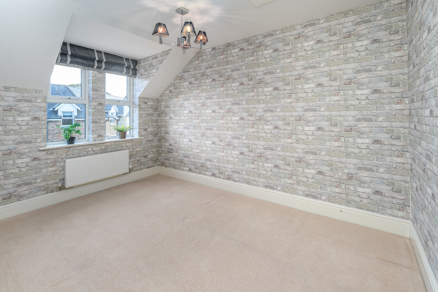 Bedroom 2 is a double room with a window to the front of the property. Loft access is available from here. This light and bright room is finished with stylish brick effect wallpaper.