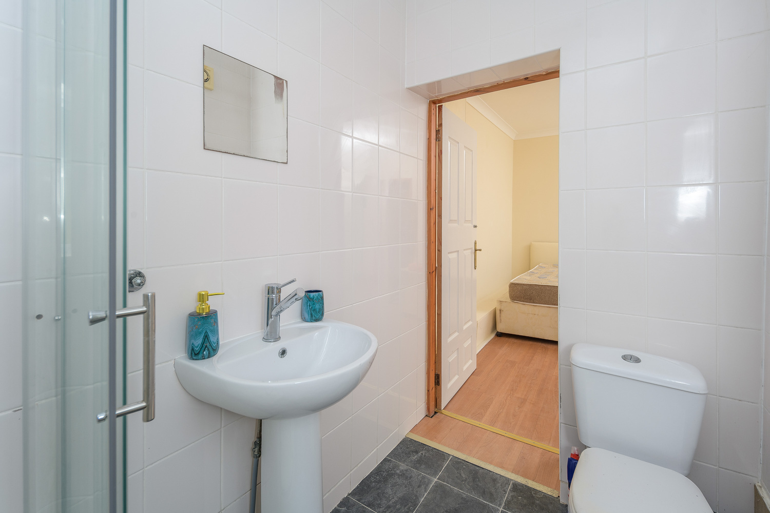 The shower room is adjacent and comprises and a pedestal hand wash basin with a chrome mixer tap above, a white close coupled toilet with a push button behind, a white towel rail, an extractor fan and a Quadrant shower cubicle with a shower within. The space is finished with white square tiling creating a crisp and fresh finish which works in harmony with the dark grey floor tiles.