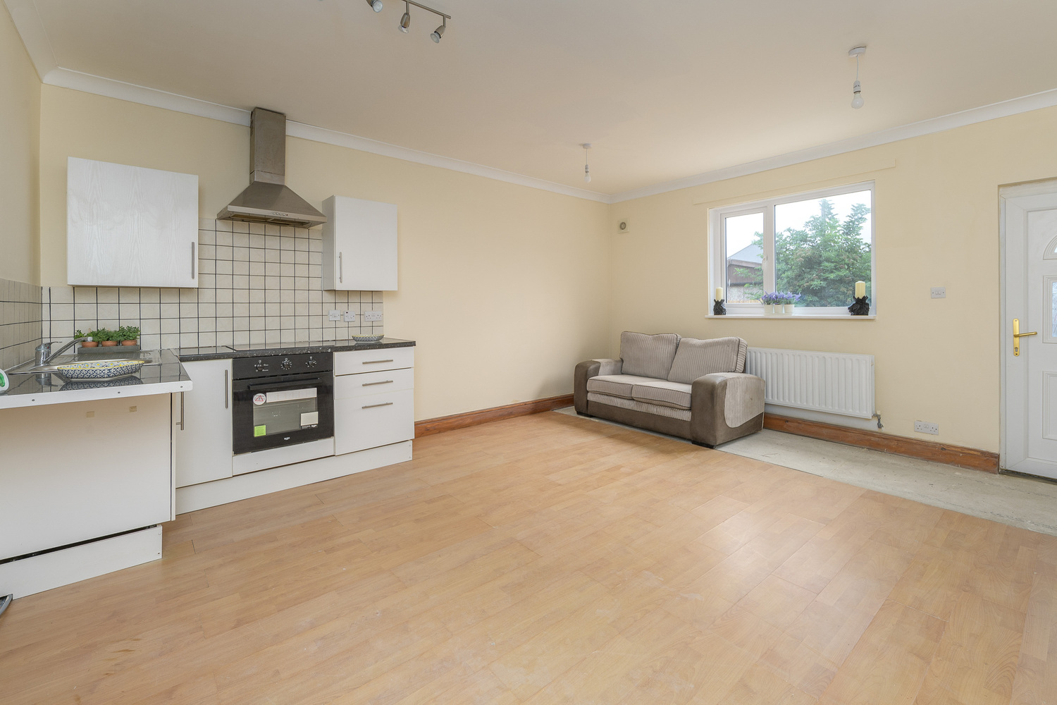The uPVC front door opens into an open plan living-dining-kitchen which is a light, bright and welcoming space with a large window overlooking the front of the property allowing plenty of natural light to circulate illuminating the wood look laminate flooring perfectly. The kitchen offers wall and base units with a white wooden door complemented by a contrasting dark coloured laminate work surface and cream splash back tiling. In terms of fitted equipment, there is a Bush oven beneath four ring induction hob and a stainless-steel chimney style extractor fan and a bowl and a half stainless steel sink with a mixer tap above. There is space and plumbing for a washing machine and space for a free-standing fridge freezer. The living room area comfortably accommodates sofas and further furniture and there is ample space to sit and dine.