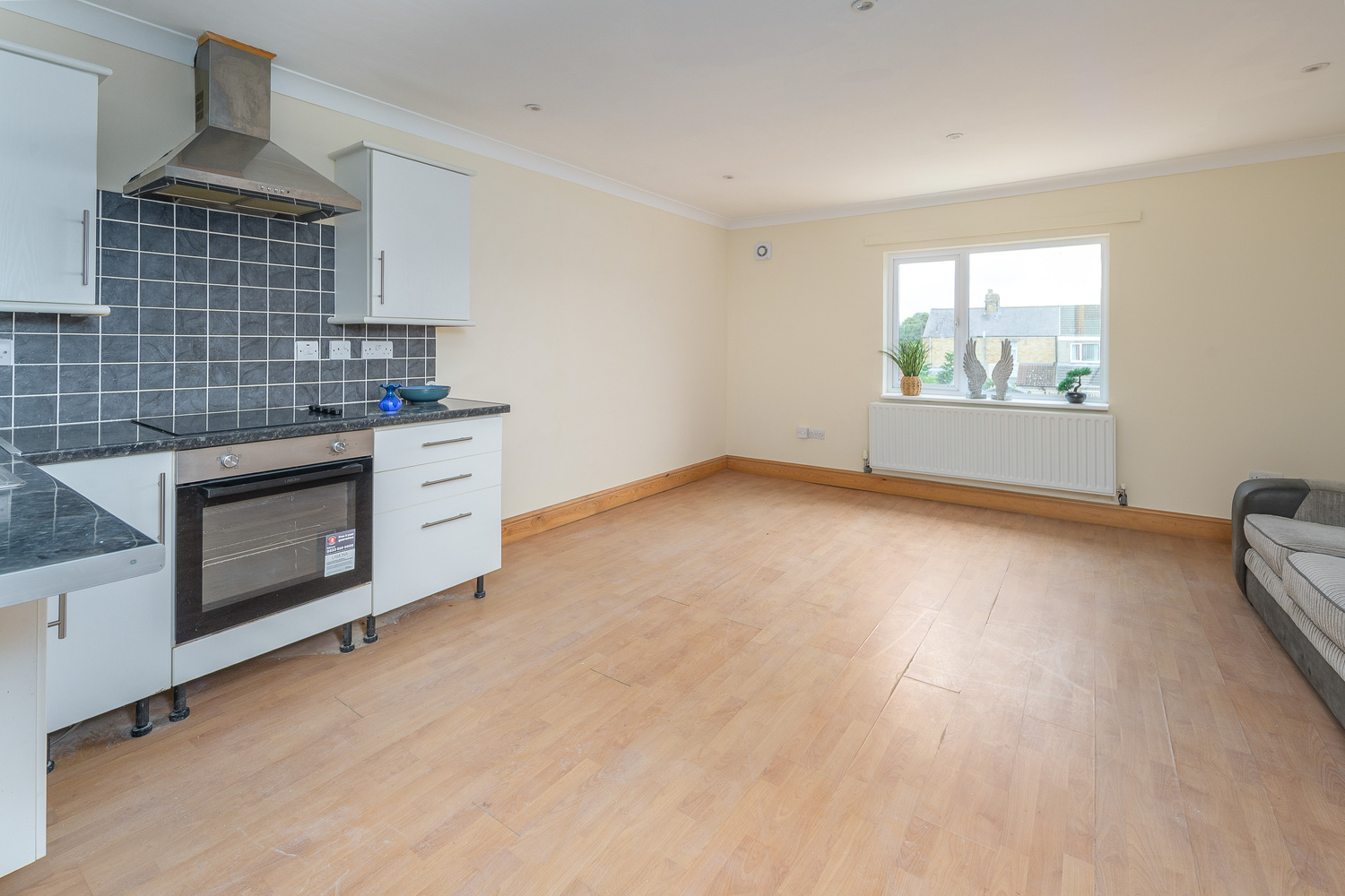 The open plan living-dining-kitchen is a light and bright welcoming space with a large window which takes advantage of the open views to the front of the property. The kitchen offers a good number of wall and base units with a white wooden door complemented by a dark coloured laminate work surface and grey splash back tiling. In terms of fitted equipment, there is a bowl and a half stainless steel sink, a Lamona four ring induction hob and a stainless-steel chimney style extractor fan above an electric oven. There is space and plumbing for a washing machine and a further appliance. The flooring is finished with laminate wood effect floor tiles. There is plenty of space to accommodate sofas and a dining table and accompanying chairs making this a lovely sociable room in which to spend time with family and friends.