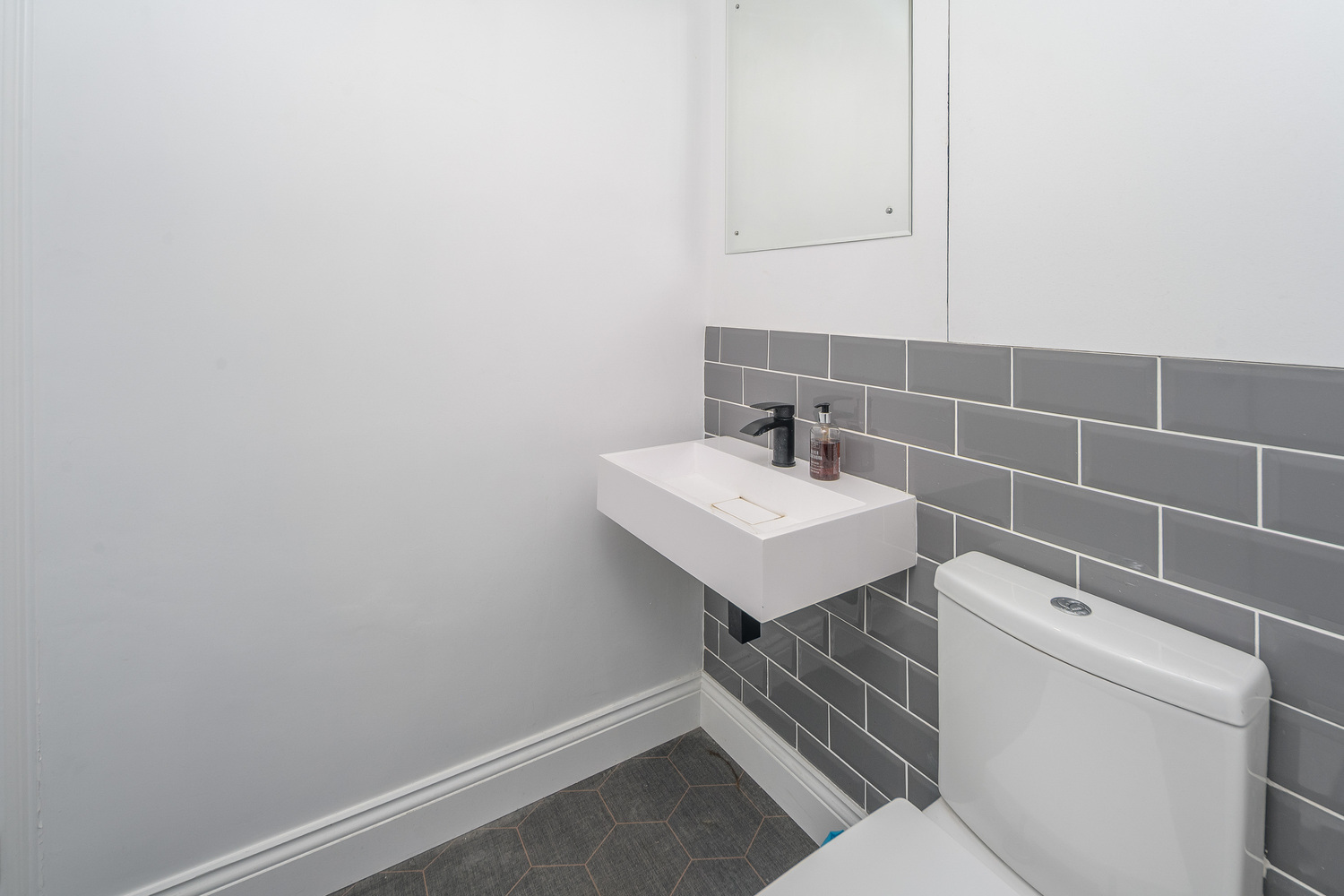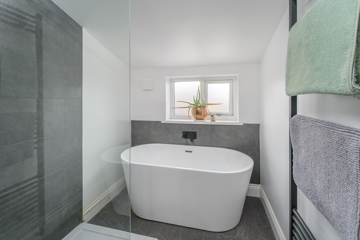 The family bathroom has been recently fitted and comprises a square wall hung hand wash basin with a black mixer tap and wall mounted mirror above, a free standing double ended bath with black taps over, a close coupled toilet with a push button behind and a slimline shower tray with a glass screen and a water fall showerhead and a separate shower head within. A window overlooks the rear courtyard with additional lighting by way of ceiling spotlights. The space has been finished with attractive grey tiling, textured honeycomb vinyl flooring and a heated towel rail ensures added comfort.