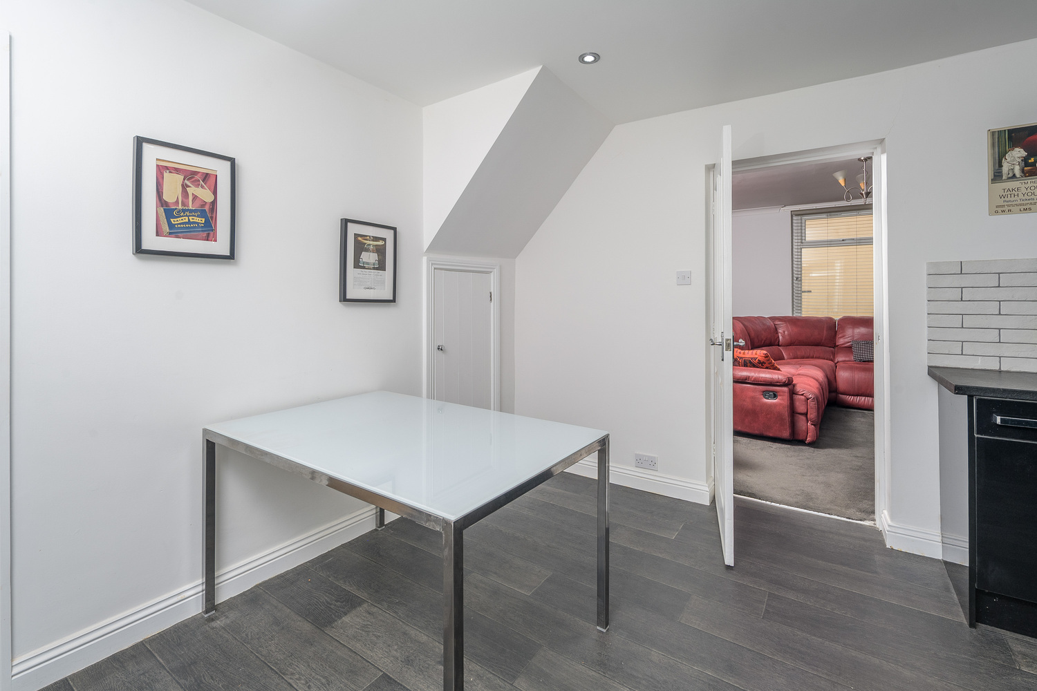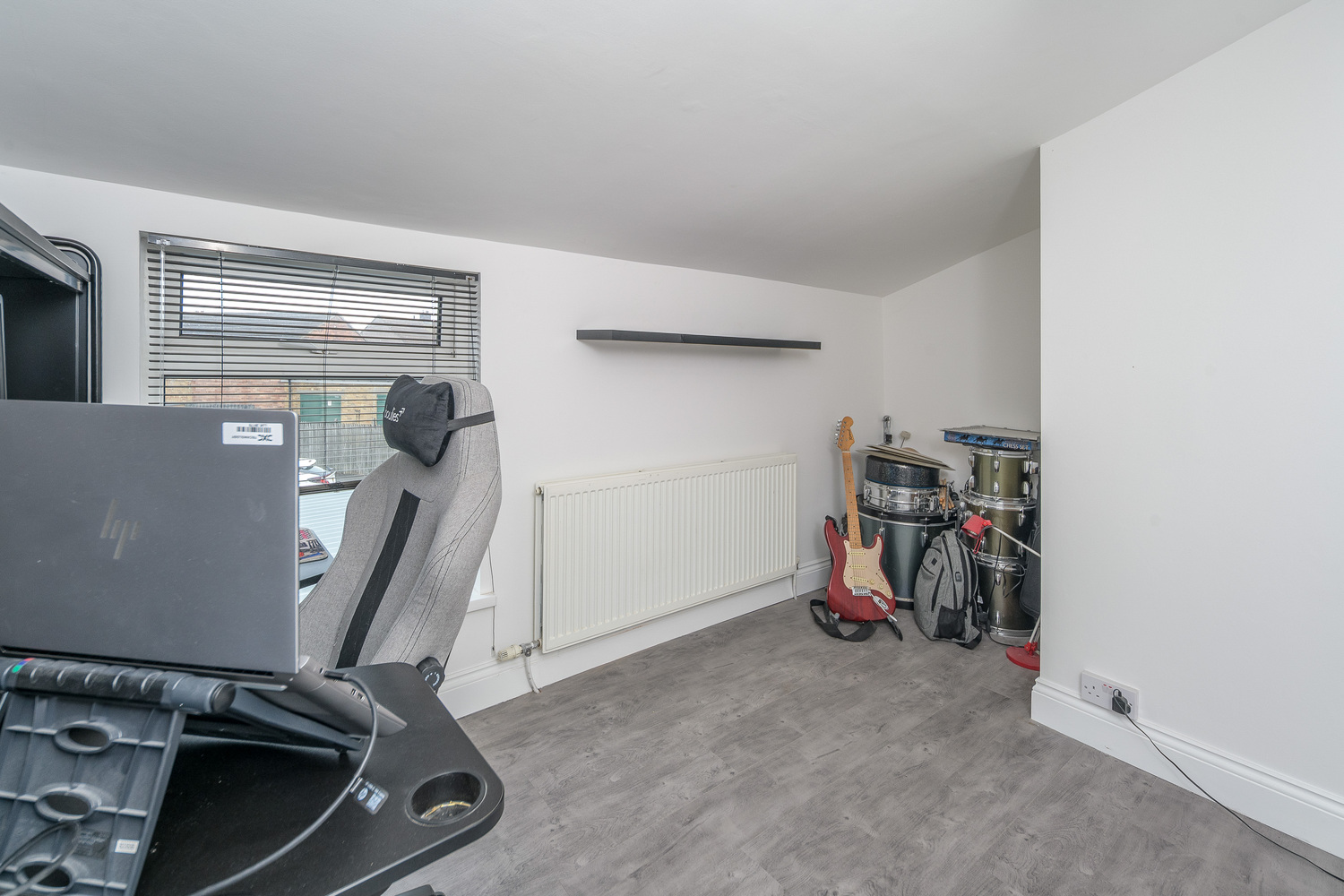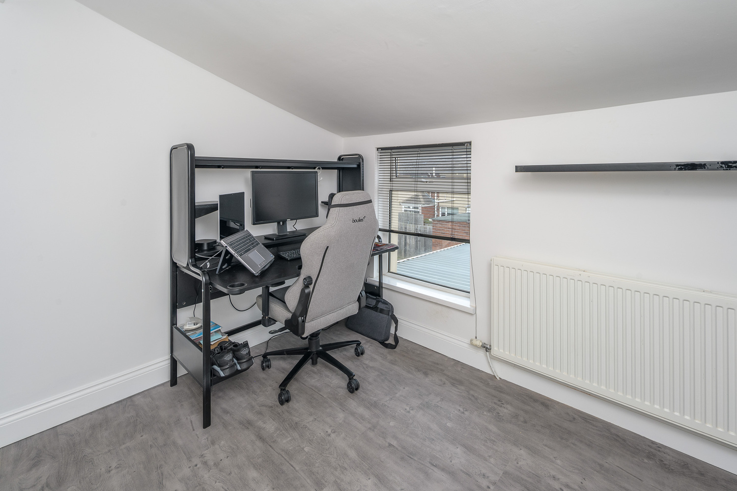 Bedroom 3 is a spacious double room with an attractive sloped ceiling and a window to the rear. This room is currently utilised as a home office and is finished with grey vinyl wood effect flooring creating a sleek and stylish look.