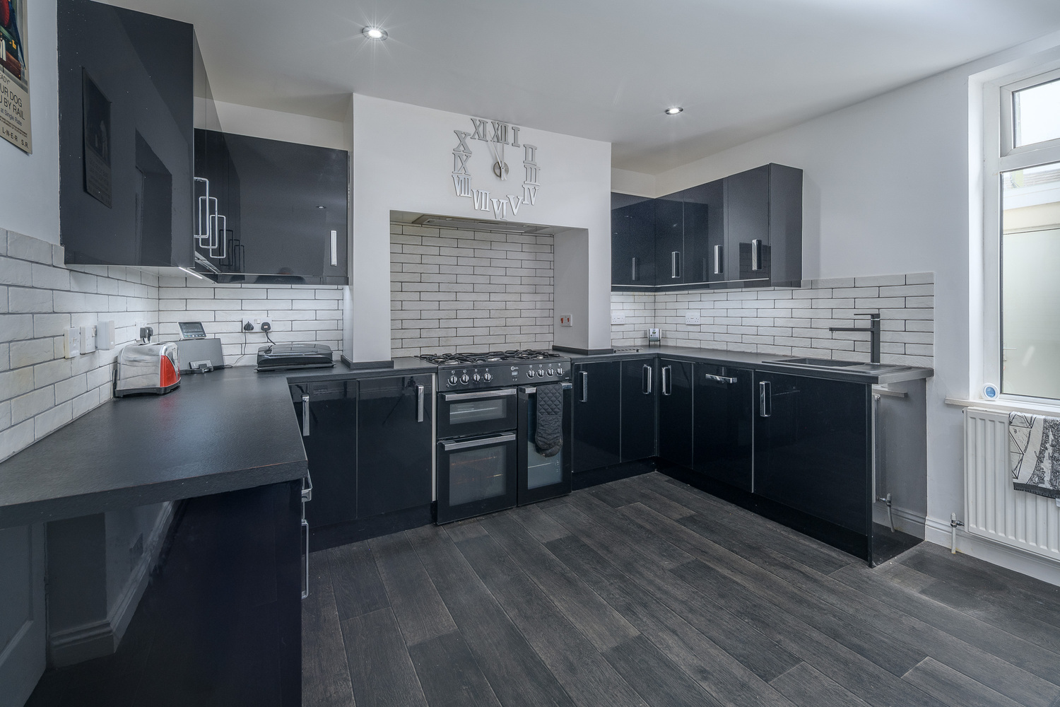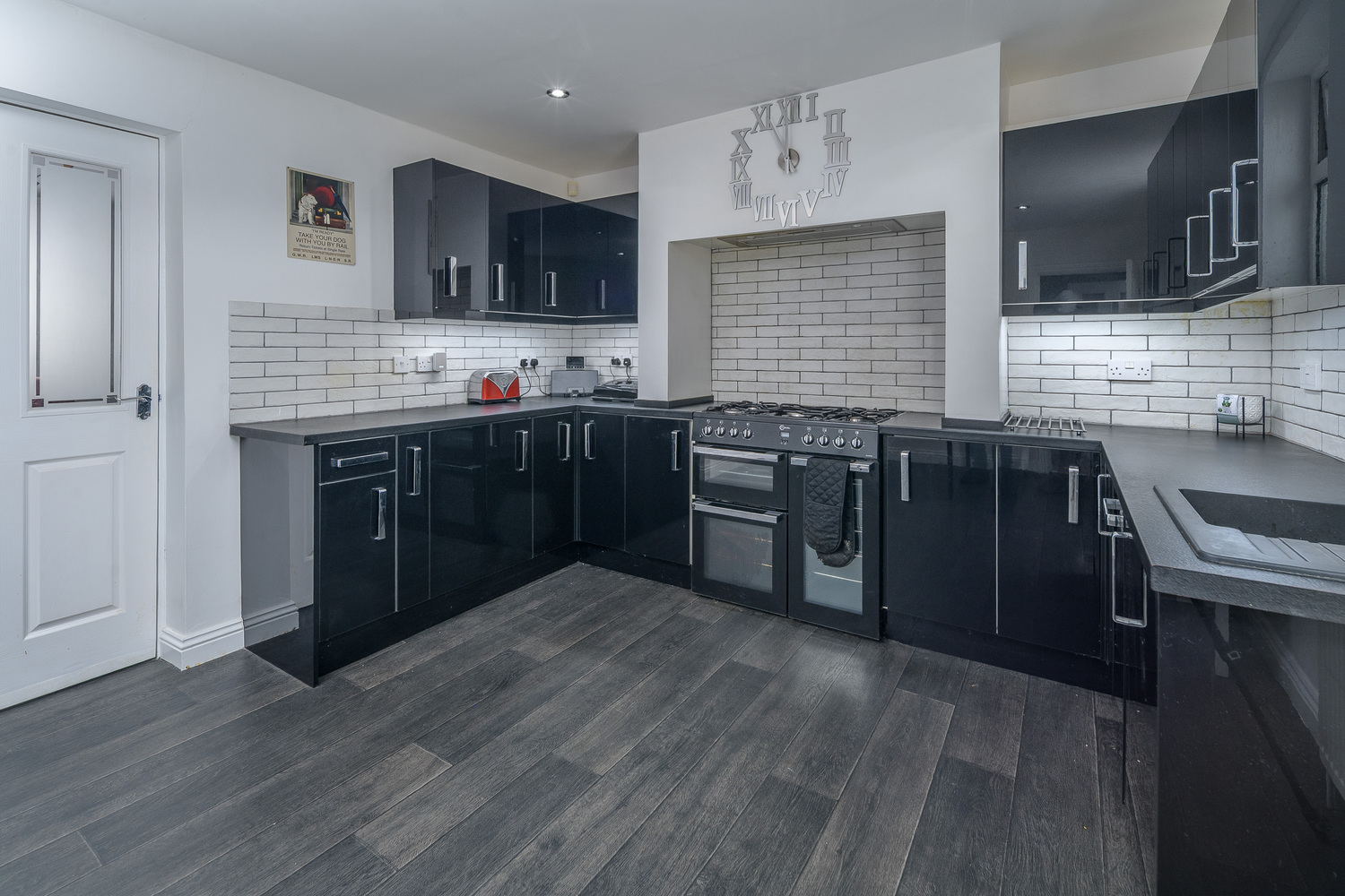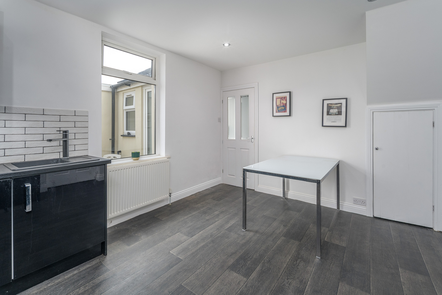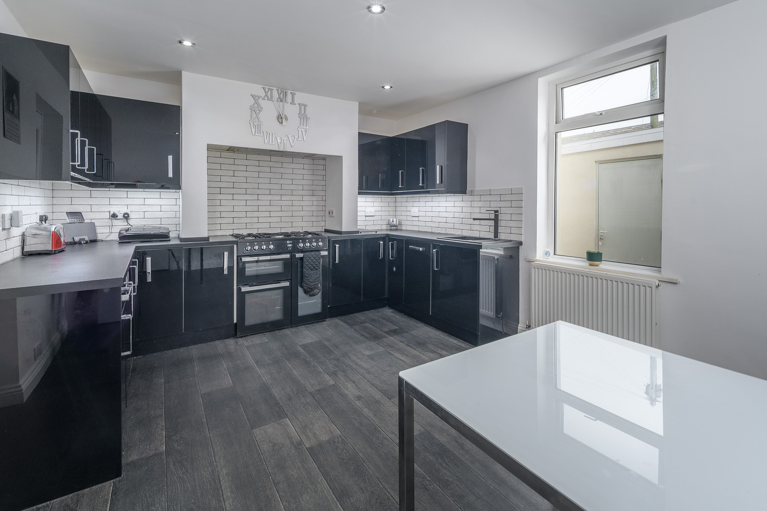 The kitchen-diner offers plenty of space to sit and dine and there are a good number of wall and base units with a black high gloss door complemented by a black laminate work surface and white brick style splash back tiling. In terms of fitted equipment, there is a large range cooker with a five-burner gas hob beneath a built-in extractor fan, a slimline dishwasher, a fridge and a black single bowl sink with drainer and a mixer tap above. The space is finished with dark flooring which works in harmony with the overall décor of the room. A window overlooks the rear yard with additional lighting by way of ceiling spotlights and a door opens to a large storage cupboard beneath the stairs.
