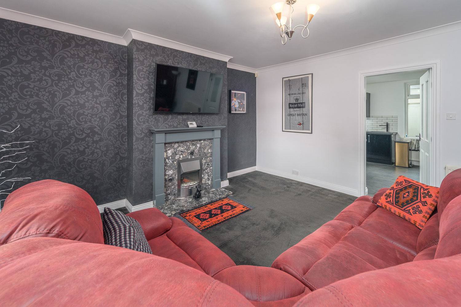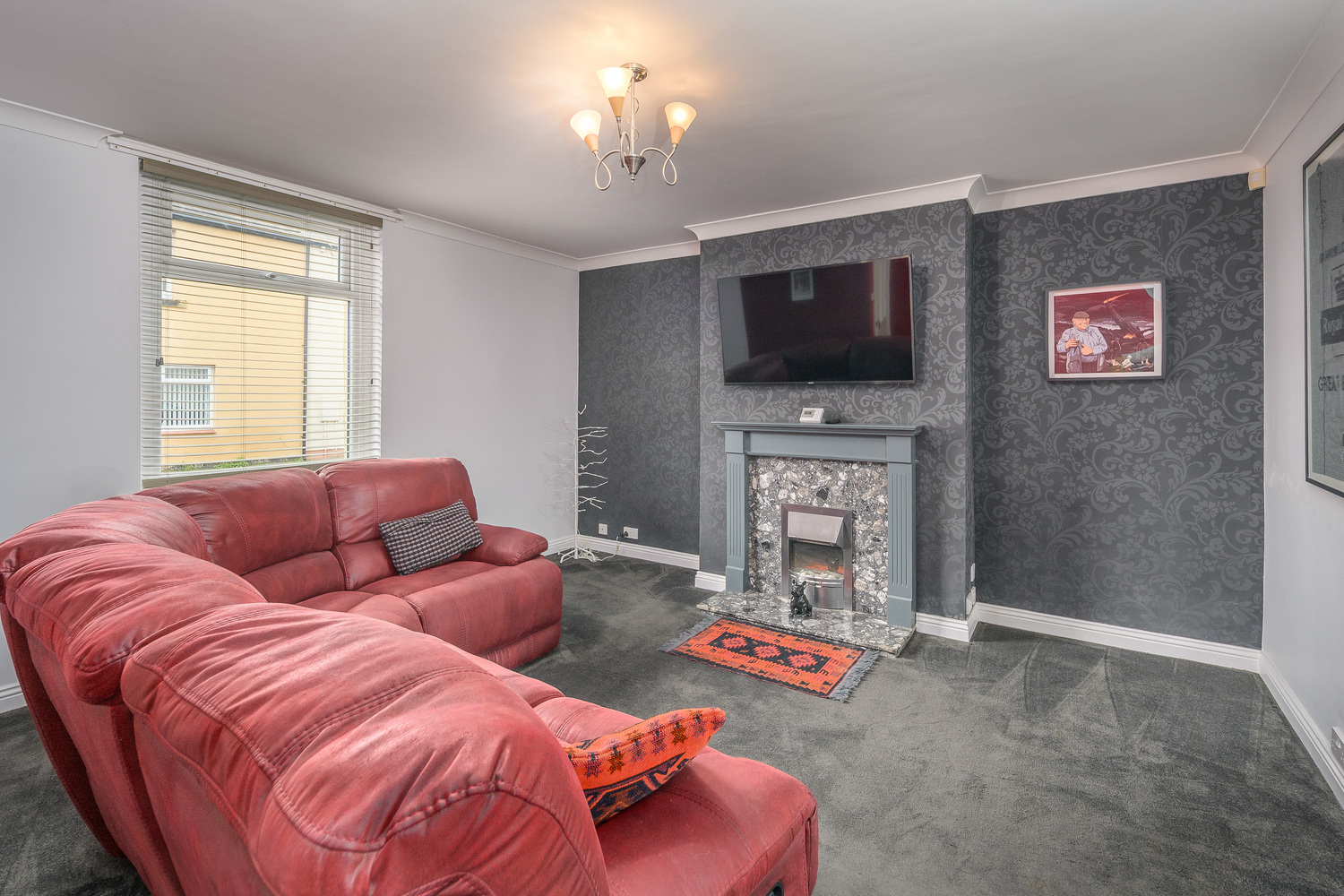 A partially glazed door opens into the lounge which is a spacious and welcoming room. A window to the front allows for natural light. There is a flame effect feature fire set on a stone hearth with a grey surround which forms an attractive focal point and entices to you sit before it during the cooler months. The television can be mounted on the chimney breast above forming a media wall effect.