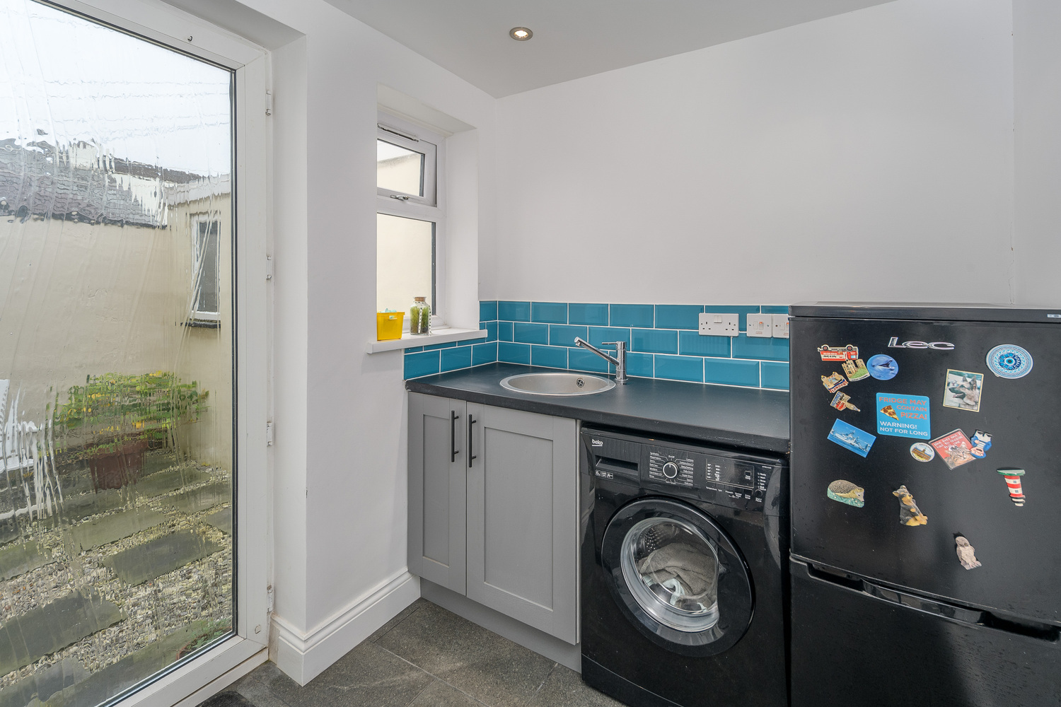 Adjacent, there is a beneficial utility room which offers further base units with grey wood effect doors complemented by a black laminate work surface and teal coloured splash back tiling. There is a single bowl stainless steel sink with a mixer tap over, space for a free-standing fridge-freezer and space and plumbing for a washing machine. A window overlooks the rear yard and a fully glazed door provides external access.