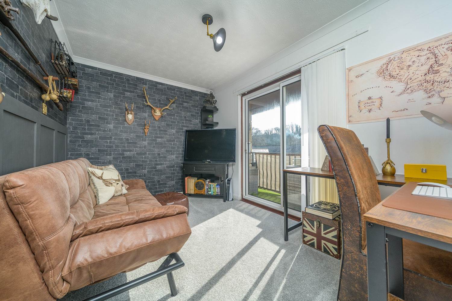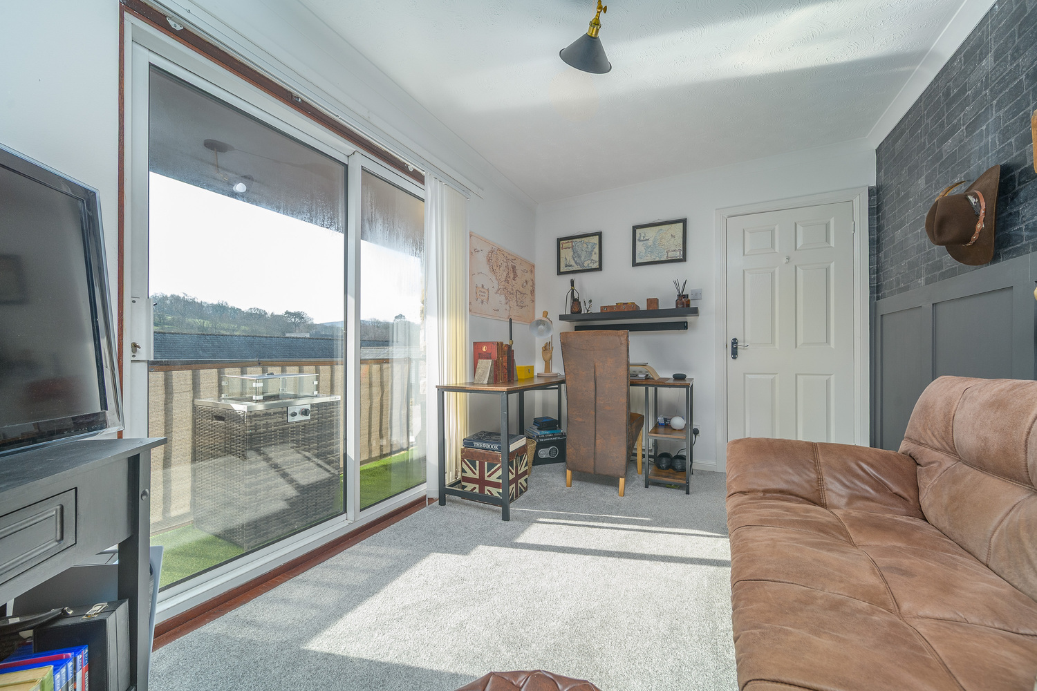 Bedroom 2/ first floor lounge is a spacious double room with a window taking advantage of views to the rear of the property. This room boasts sliding doors which open onto a balcony which is the perfect place in which to catch the westerly sunshine with a glass of wine in the evening. This room is currently utilised as an office/snug.