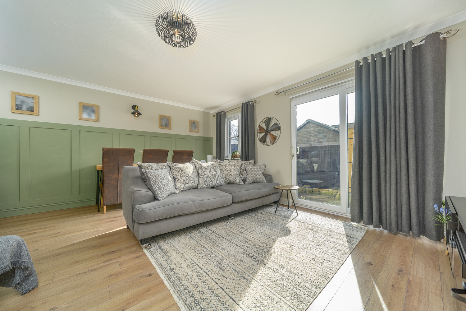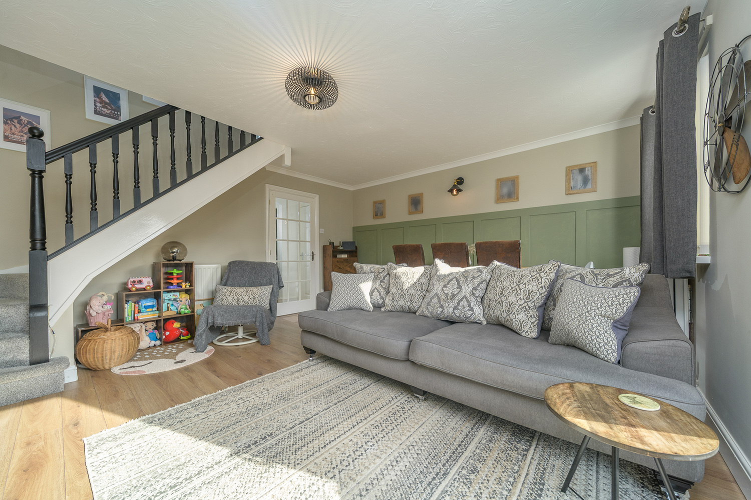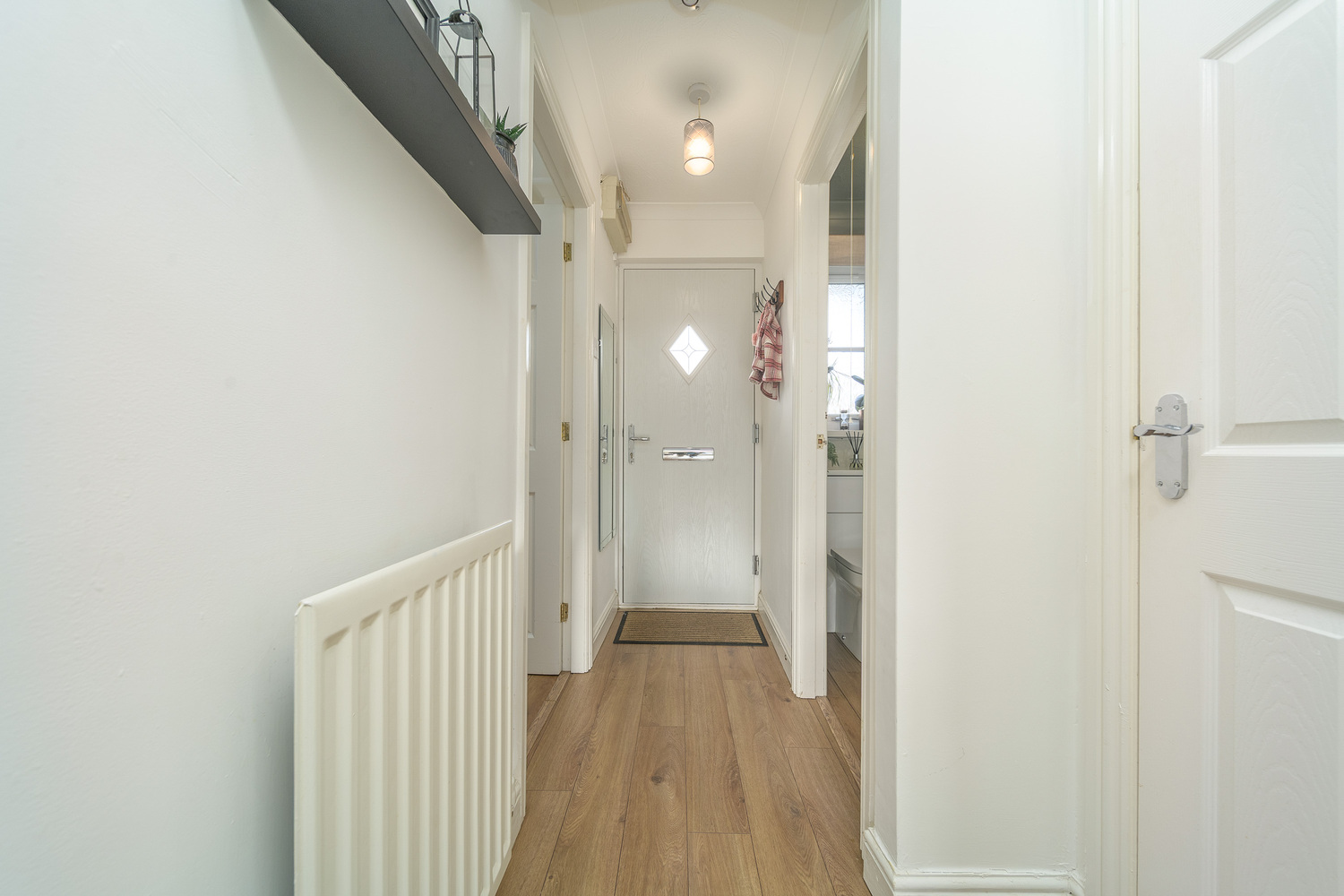 The front door opens into an entrance hallway which offers useful space to hang coats and store shoes in addition to housing the electrical consumer unit. The space is finished with laminate wood-look flooring which continues throughout the ground floor creating a seamless transition between the different spaces. The hallway provides convenient access to the spacious kitchen, welcoming lounge-diner and the ground floor WC which is a superb asset as it negates the need to continually frequent the upstairs facilities. The suite comprises a concealed cistern toilet with a push button behind and a rectangular sink on top of a vanity unit. A window allows for natural light.