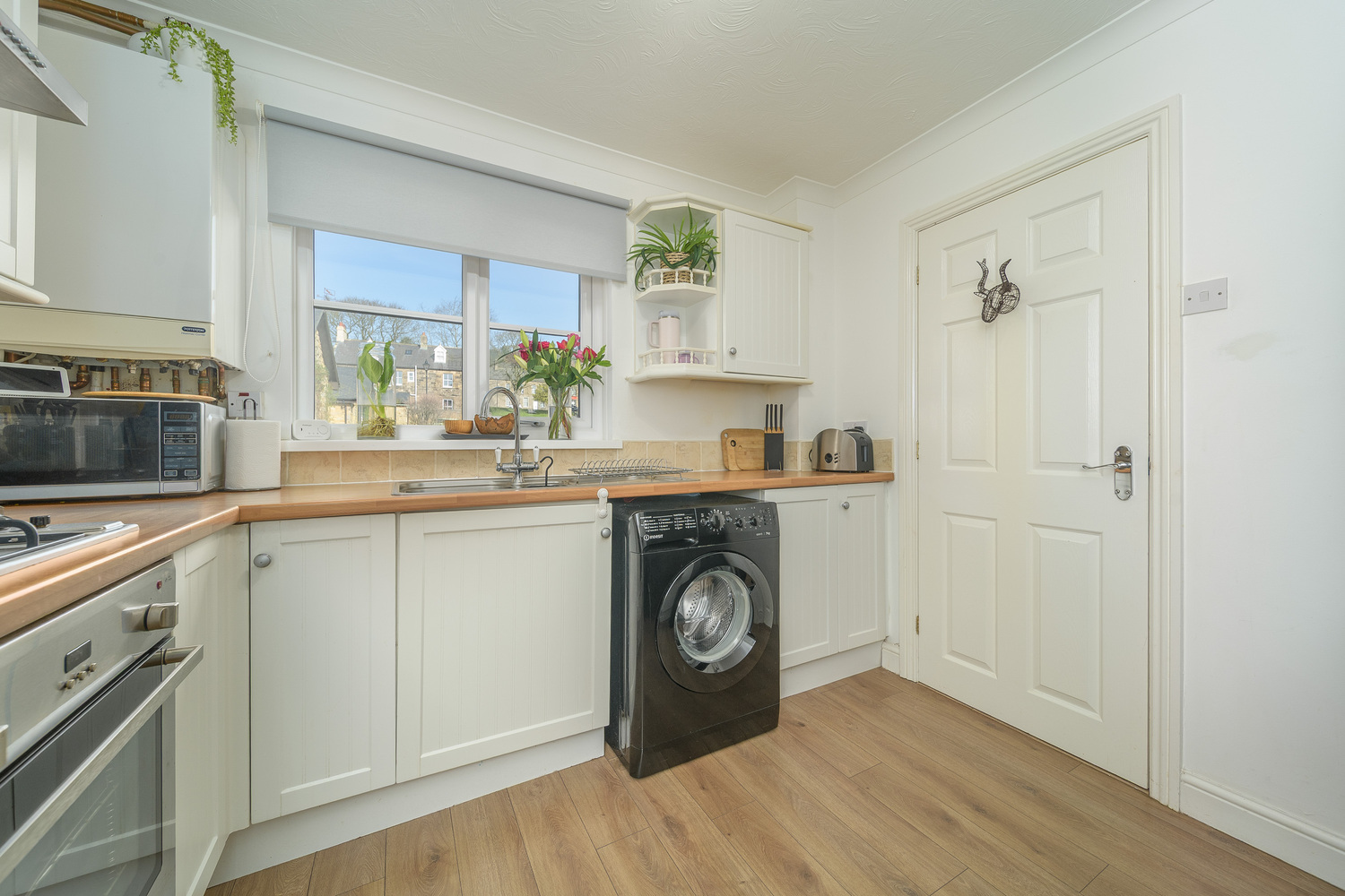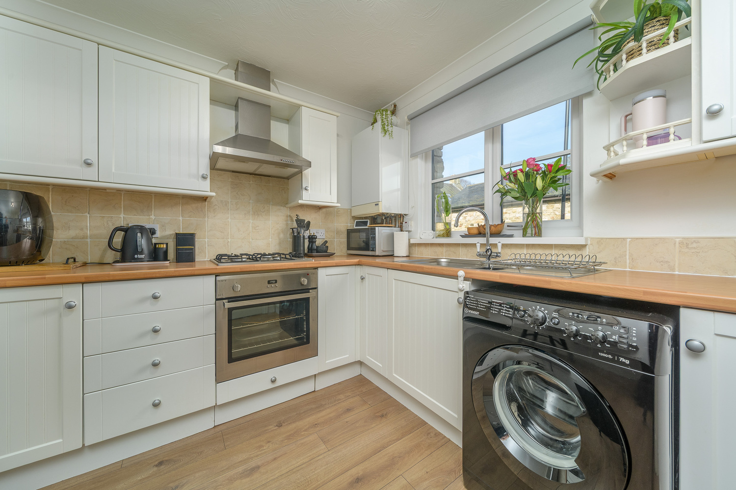 Incorporating a drop-down breakfast bar ideal for use during breakfast or a light lunch, the kitchen offers a good number of wall and base units with a cream-coloured shaker style door complemented by a contrasting laminate wood block style work surface and stone effect splash back tiling. There is an under-bench oven, a four-burner gas hob beneath a chimney style extractor fan and a Franke bowl and a half stainless steel sink. The boiler is housed in a wall unit for ease of access and there is space for a free-standing fridge freezer and space and plumbing for a washing machine/tumble dryer. Natural light enters via a window to the front of the property which captures village views with the Cragside hills in the background.