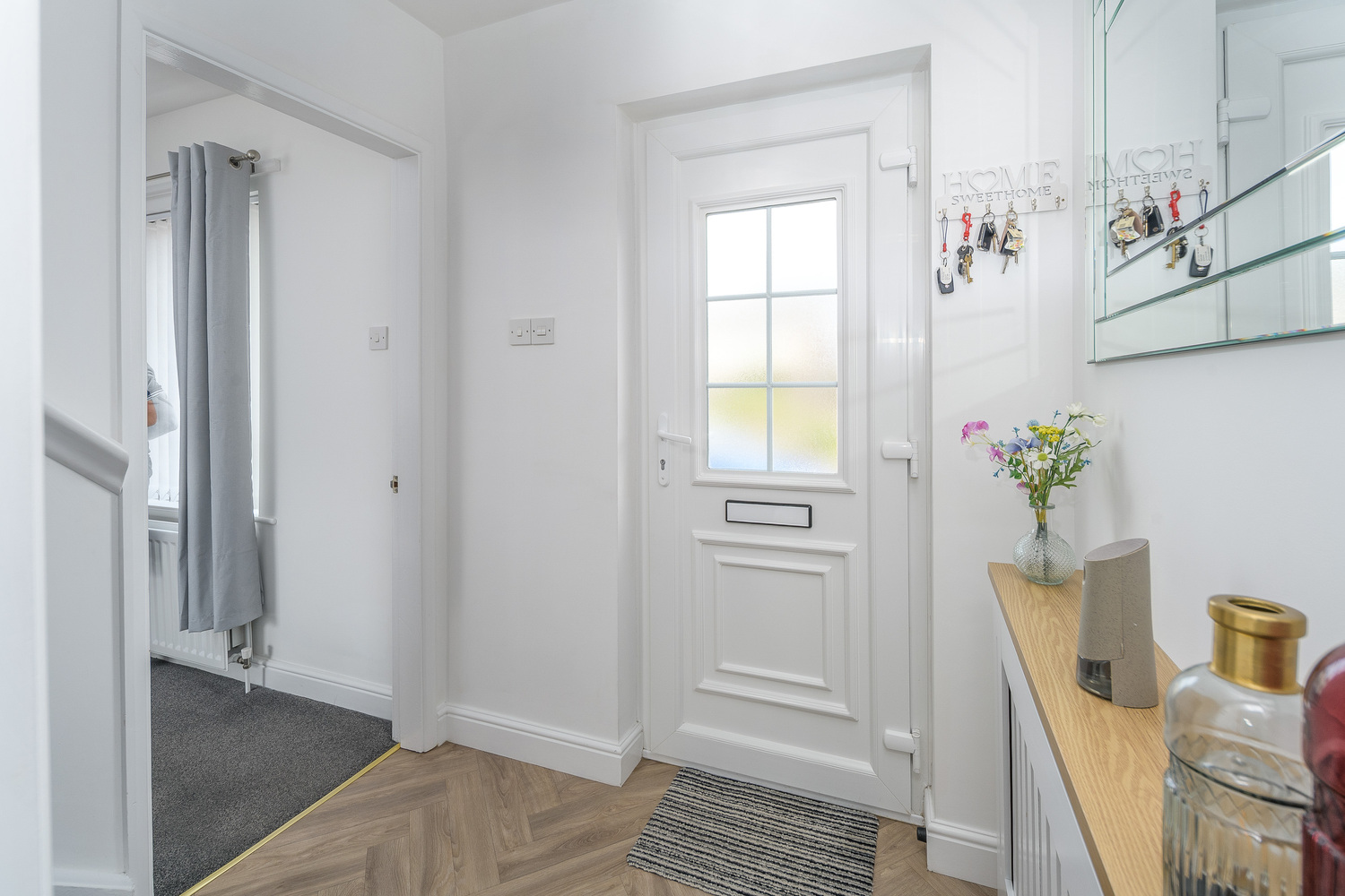 The property is approached via a wrought iron gate before five steps leading to a low maintenance front garden offering gravelled spaces to either side of the front door, with storm canopy over, which opens into an entrance hallway. Two doors lead off, one to the lounge and one to the kitchen. This light and bright space is neutrally decorated allowing the easy addition of accent colour should you so wish. The radiator, with attractive cover, is a pleasant feature as is the wood effect vinyl flooring which extends into the kitchen creating a seamless transition between the different spaces.