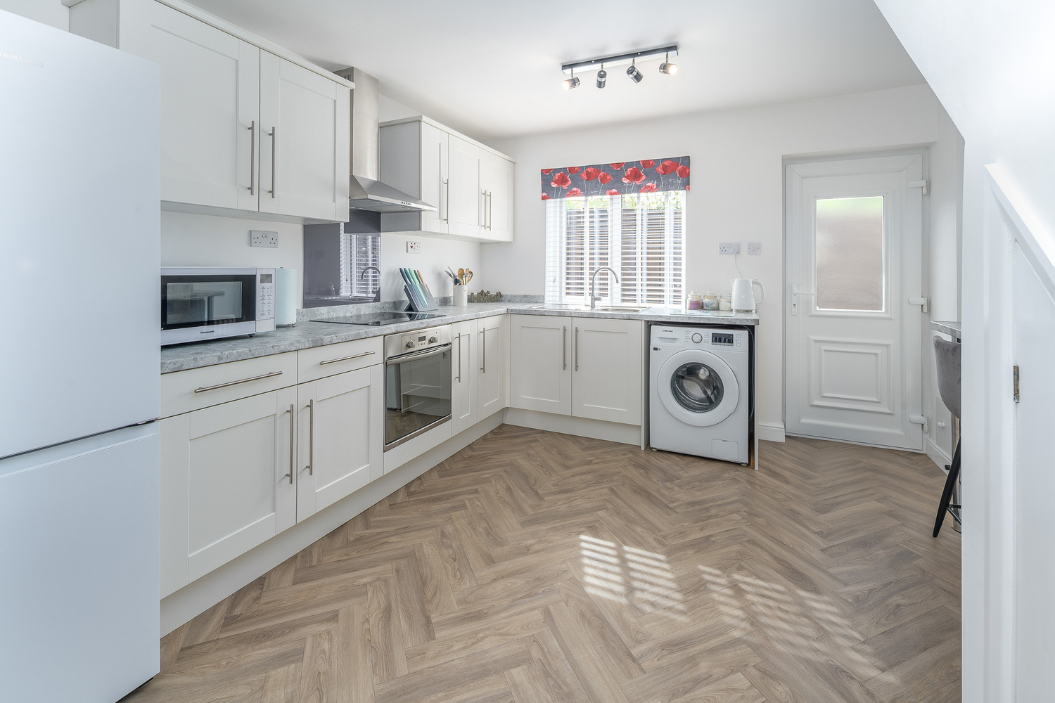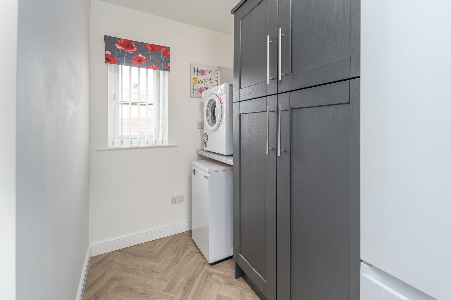 The kitchen, with a window overlooking the rear garden, offers a good number of wall and base units with a white wood effect door with brushed chrome handles complemented by a contrasting grey laminate work surface. In terms of fitted equipment, there is a four-place induction hob, an oven beneath a glass splash back and stainless-steel chimney style extractor fan, a single bowl stainless steel sink with a mixer tap over and space and plumbing for a washing machine. Opposite, there is a breakfast bar offering seating and additional bench space. The kitchen also benefits from an additional pantry cupboard and utility space to house the oil boiler and tumble dryer and space for a free-standing fridge-freezer. A window overlooks the front garden and allows plenty of natural light. A uPVC door provides external access to the rear garden.