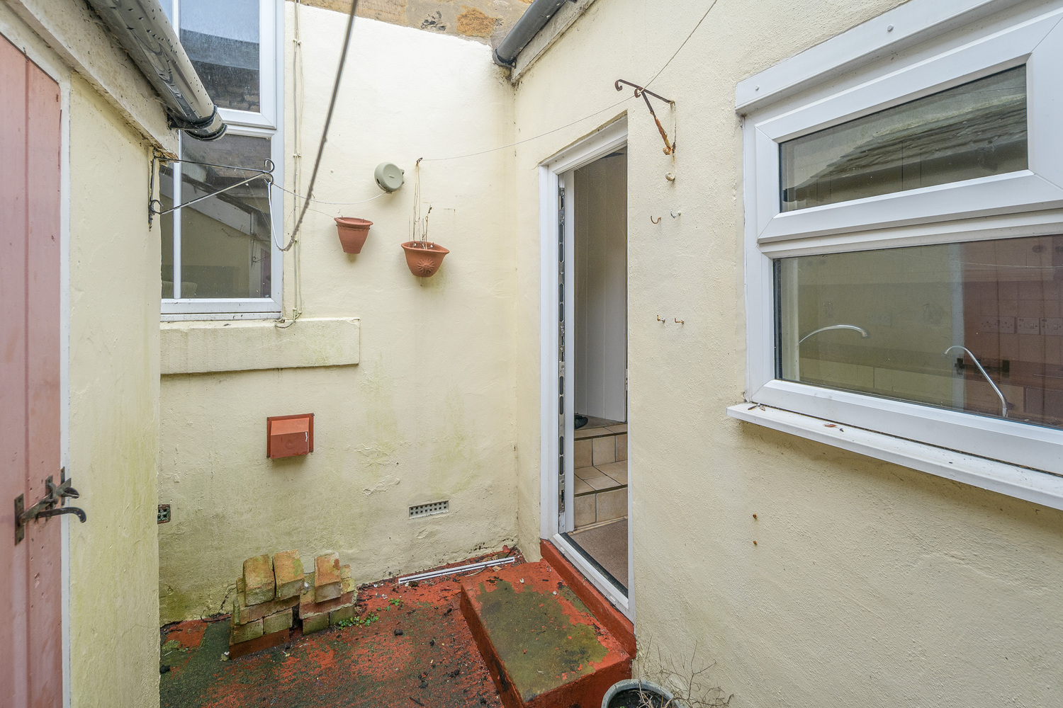 The kitchen, within the extended part of the home, offers a good number of wall and base units with a light-coloured shaker style door complemented by a wood look work surface. There is a bowl and a half stainless steel sink with a filtered water tap beneath a window to the rear, a BOSCH four burner gas hob with an extractor fan above, an electric under bench oven, space for two further under bench appliances and space for a free-standing fridge freezer. There is plenty of room to sit and dine. The room has been finished with a practical tiled floor, a uPVC door provides external access to the courtyard and a further door opens onto the rear lane which extends behind the terrace of properties.