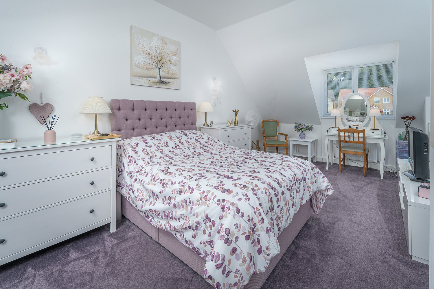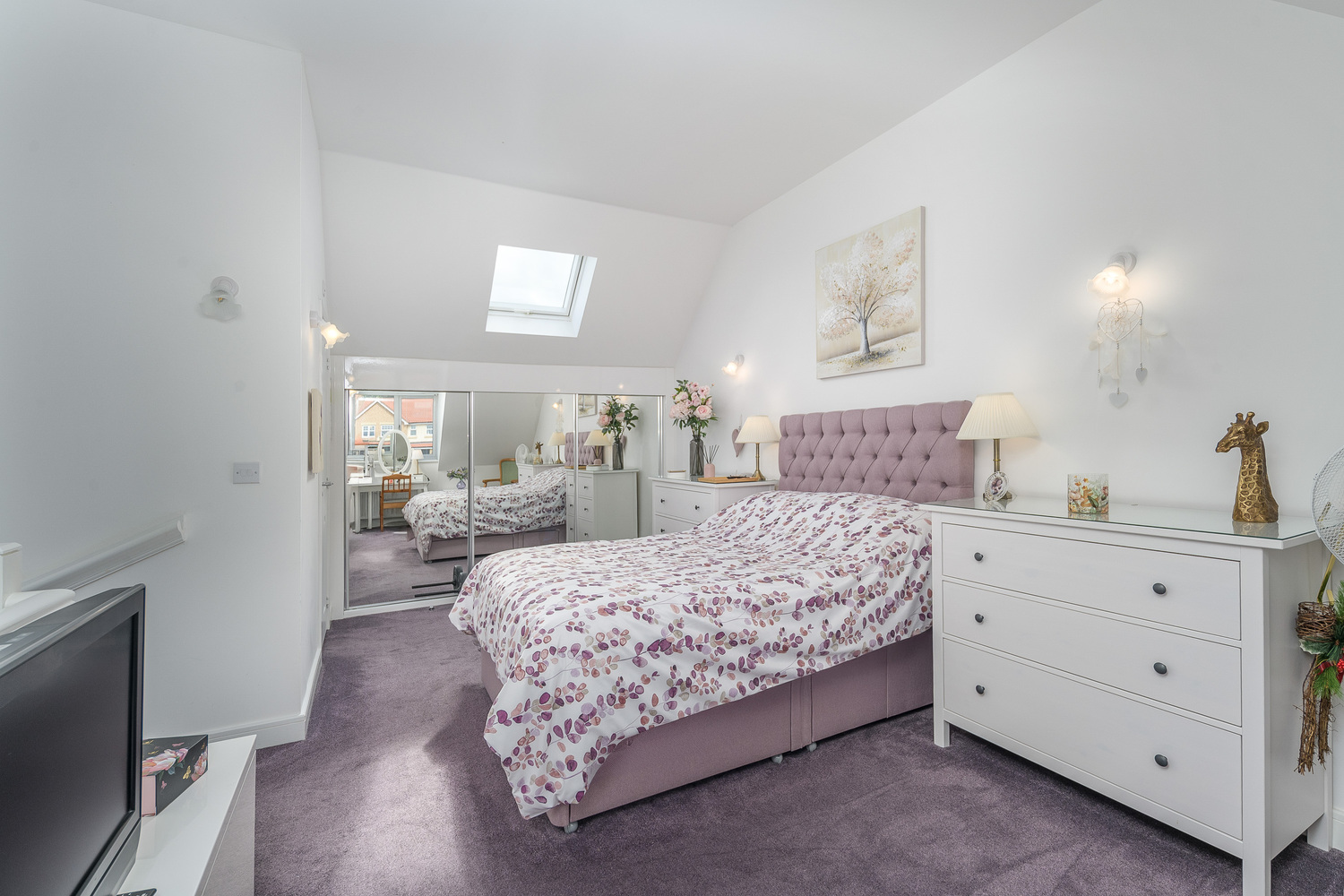 The primary suite is located on the second floor and is a haven of peace and tranquillity being further removed from the main hub of the home. This light and bright bedroom is a large double with a semi-vaulted ceiling and a large window to the front with far reaching views. A Velux window opposite allows further natural light to enter. There is a bank of built-in mirrored sliding door wardrobes and to the other side there is a fabulous en-suite. This space has been furnished with flooring matching that of the family bathroom and comprises a double sized shower cubicle with a sliding door and an electric shower within, a close coupled toilet with a push button and a pedestal wash hand basin. A Velux window within the semi-vaulted ceiling allows for natural light. The walls have been finished with slightly embossed tiling which completes the look perfectly.
