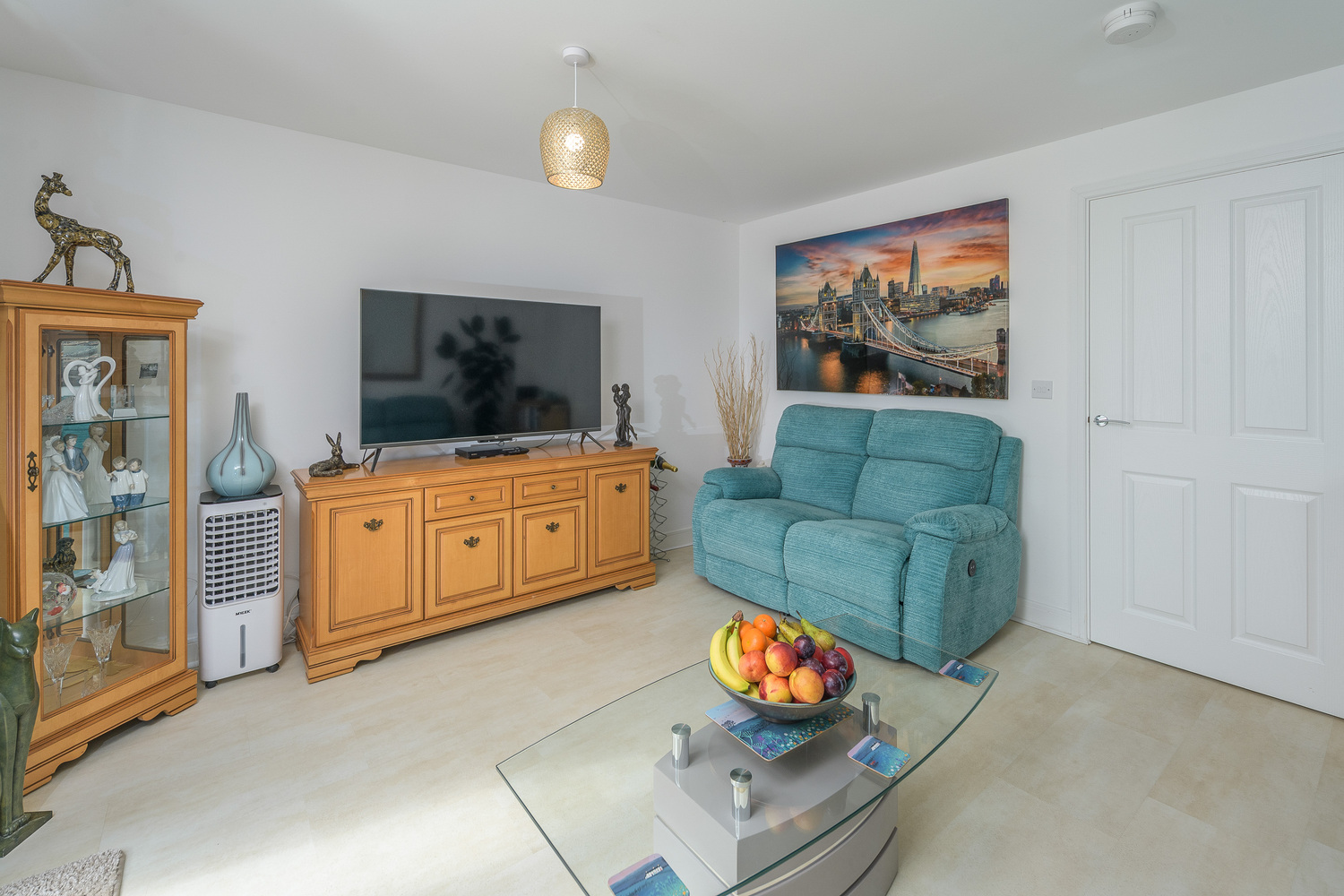 Capturing a lovely view over the front garden, the kitchen-breakfast room is an inviting space. There are plenty of wall and base units with a matt white door complemented by a dark coloured work surface with a matching upstand. In terms of fitted equipment, there is a four-burner gas hob beneath a stainless-steel splash back and built-in extractor fan, a Zanussi eye-level oven and a single bowl stainless steel sink. There is plumbing and space for a washing machine, a free-standing fridge-freezer and a further under bench appliance. The gas boiler is housed in a wall unit for ease of access and there is beneficial bench lighting. The space has been completed by sandstone-coloured LVT flooring and there is ample space to sit and dine before the window overlooking the front of the property: a glorious open vista. The flooring continues into the hallway and into the lounge at the rear which creates a seamless transition between the different spaces.